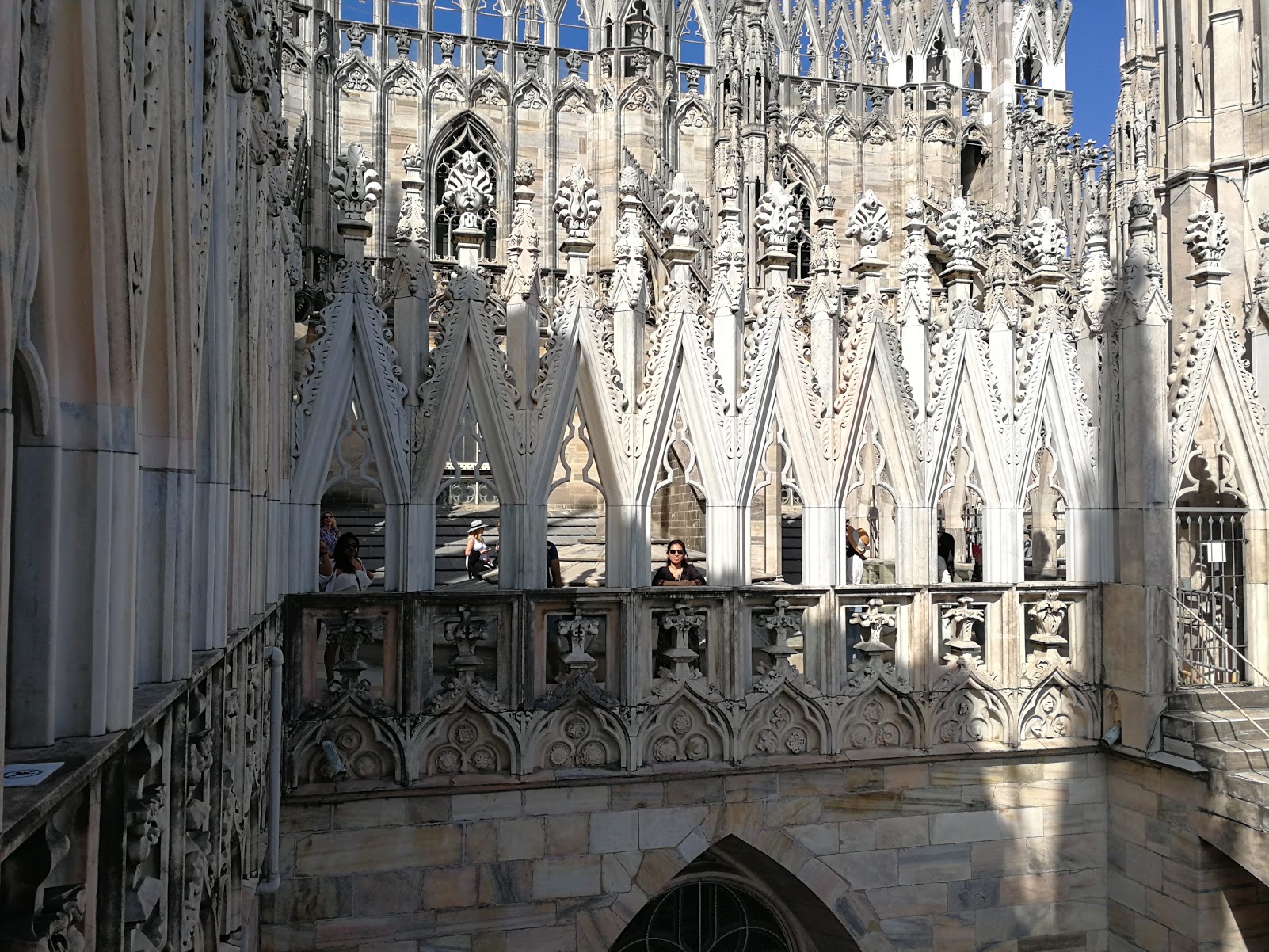 Es todo de mármol, es impresionante, incluso el techo. Se puede pasear por la terraza y subir por una pequeña escalera para ver todas las esculturas de mármol que te mostré en la parte superior. Desde aquí, podemos ver algunos restaurantes con azotea, lo que nos hace desear