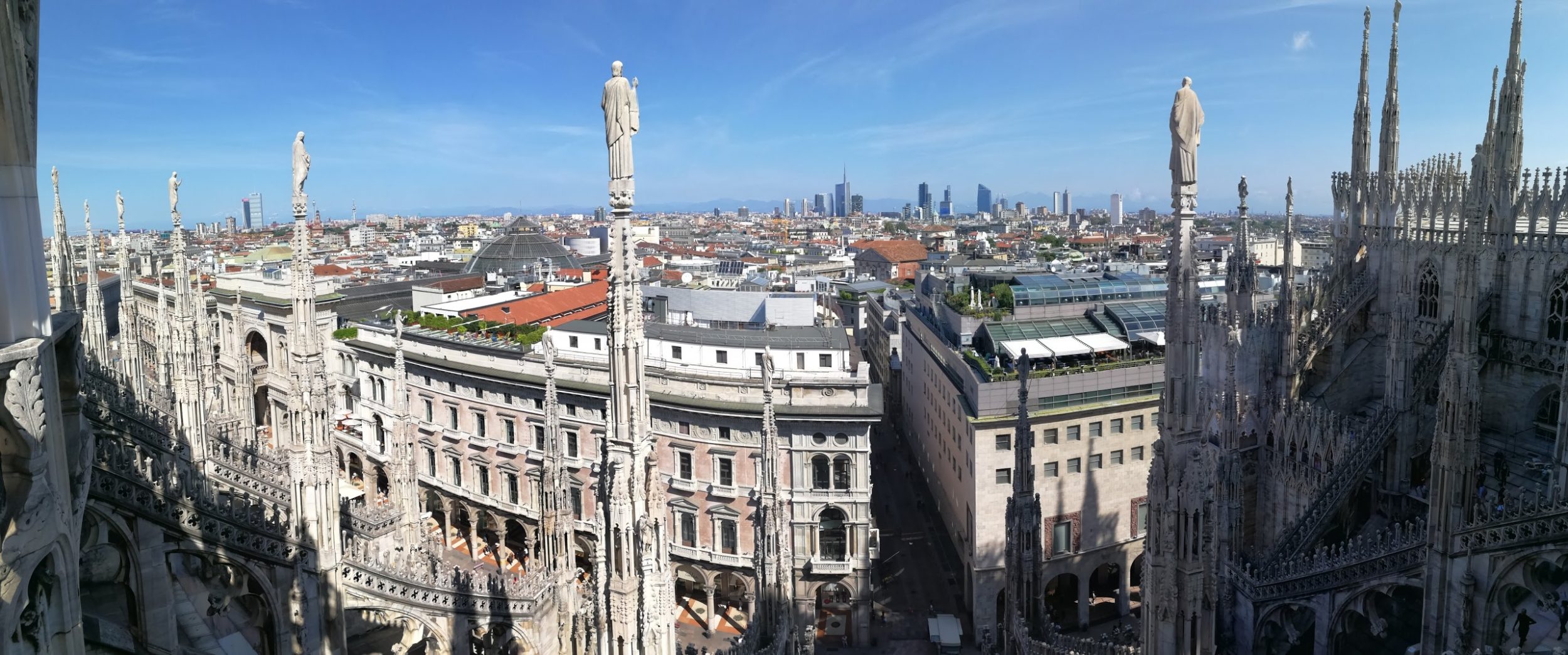 Vamos a los cercanos grandes almacenes La Rinascente, los que tienen una azotea para comer. Por 20€/persona vamos a un almuerzo muy correcto con vistas a la catedral