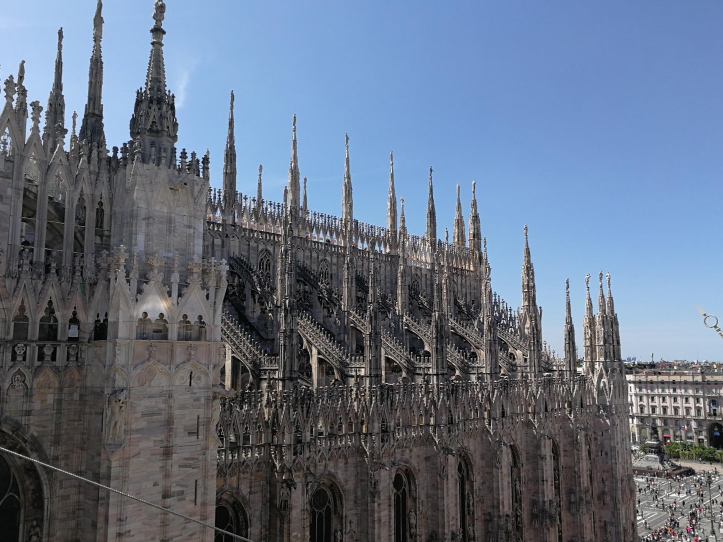 Compramos una vía rápida (25€ en lugar de 16€) para no tener que hacer cola delante de la catedral. Al pagar más, conseguimos un ascensor VIP, sin la cola, para subir a la parte superior y tener acceso a la terraza. Aquellos que ya tengan una entrada normal (comprada en línea, por ejemplo) pueden pagar 9 euros más por el cortador de alambre si lo desean. Está menos concurrido que de costumbre, pero el sol aprieta y la pereza me gana, así que he preferido optar por la vía rápida