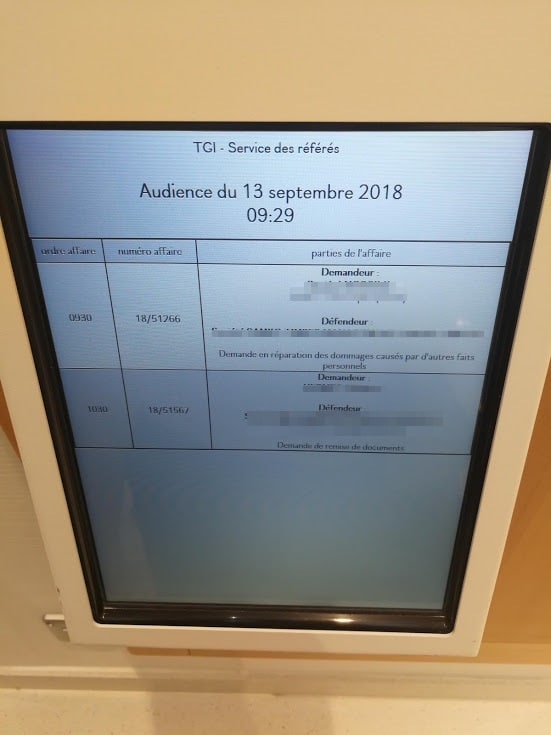 Por mi parte, he asistido a las audiencias del Tribunal d’Instance (que juzga los litigios de cuantía inferior a 10.000 euros) y del Tribunal de Grande Instance (de cuantía superior a 10.000 euros).