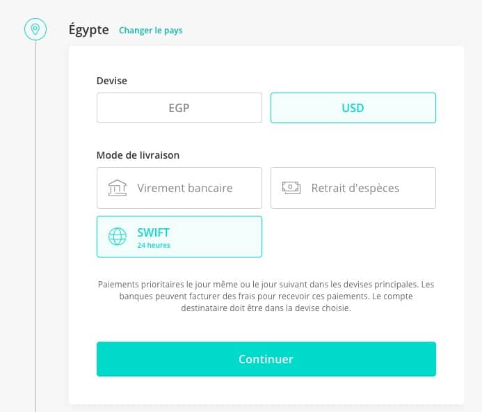 Primero debe elegir el país, la moneda y el método de recepción de su transacción (incluso es posible solicitar una retirada de efectivo, como en el caso de Western Union).