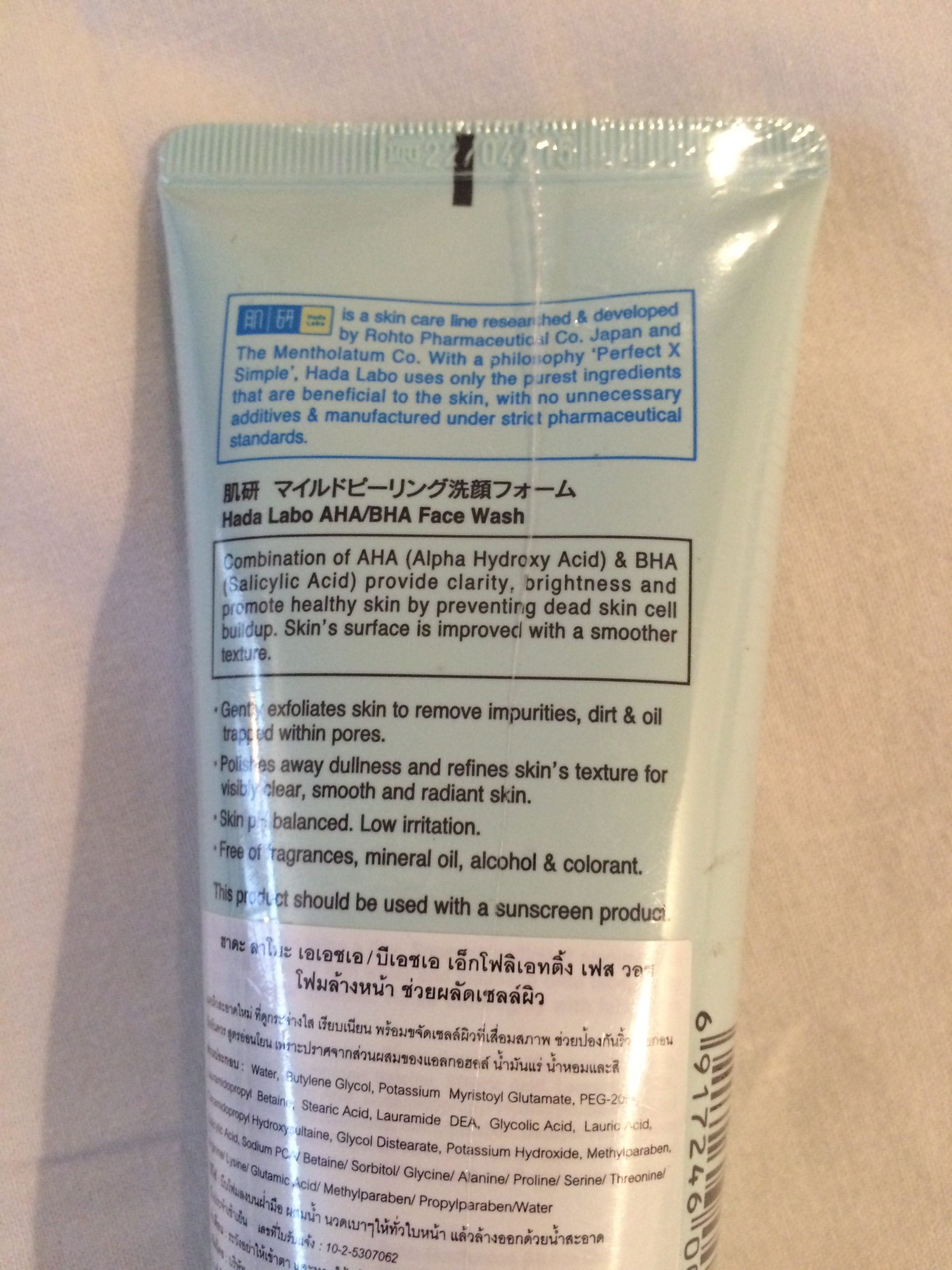 Esto no estaba previsto: el limpiador facial AHA/BHA de Hada Labo, pero hay pocos limpiadores AHA/BHA de buena calidad (excepto en COSRX) así que voy a darle una oportunidad a este tubo grande de Hada Labo. Debido a la presencia de AHA, es absolutamente necesario utilizar un protector solar después de su uso. He pagado 339 baht o 8,6€.
