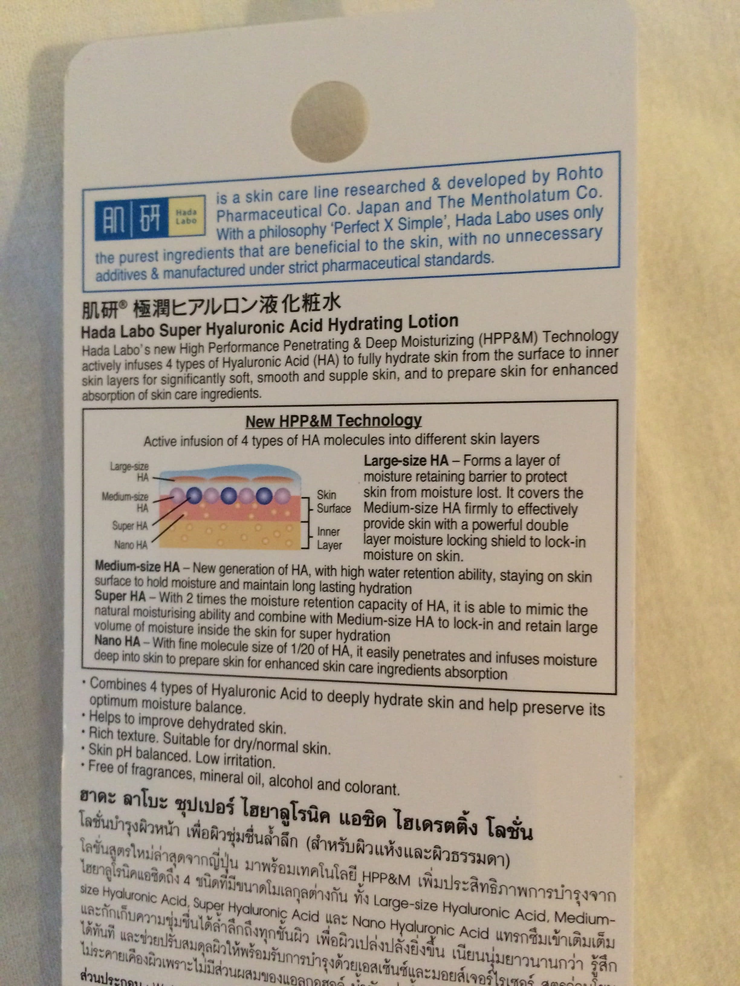 Aquí está la mejor loción del mundo: Hada Labo Super Hyaluronic Acid Hydrating Lotion, también conocida como Hada Labo Rohto Gokujyn Hyaluronic Acid Lotion. Contiene 4 tipos de ácido hialurónico de diferentes tamaños, lo que permite que las moléculas profundicen e hidraten la piel en varias capas. Lo uso como sérum e hidratante porque aquí hace mucho calor. Una crema hidratante habría bloqueado los poros. La textura es bastante extraña: es casi líquida.