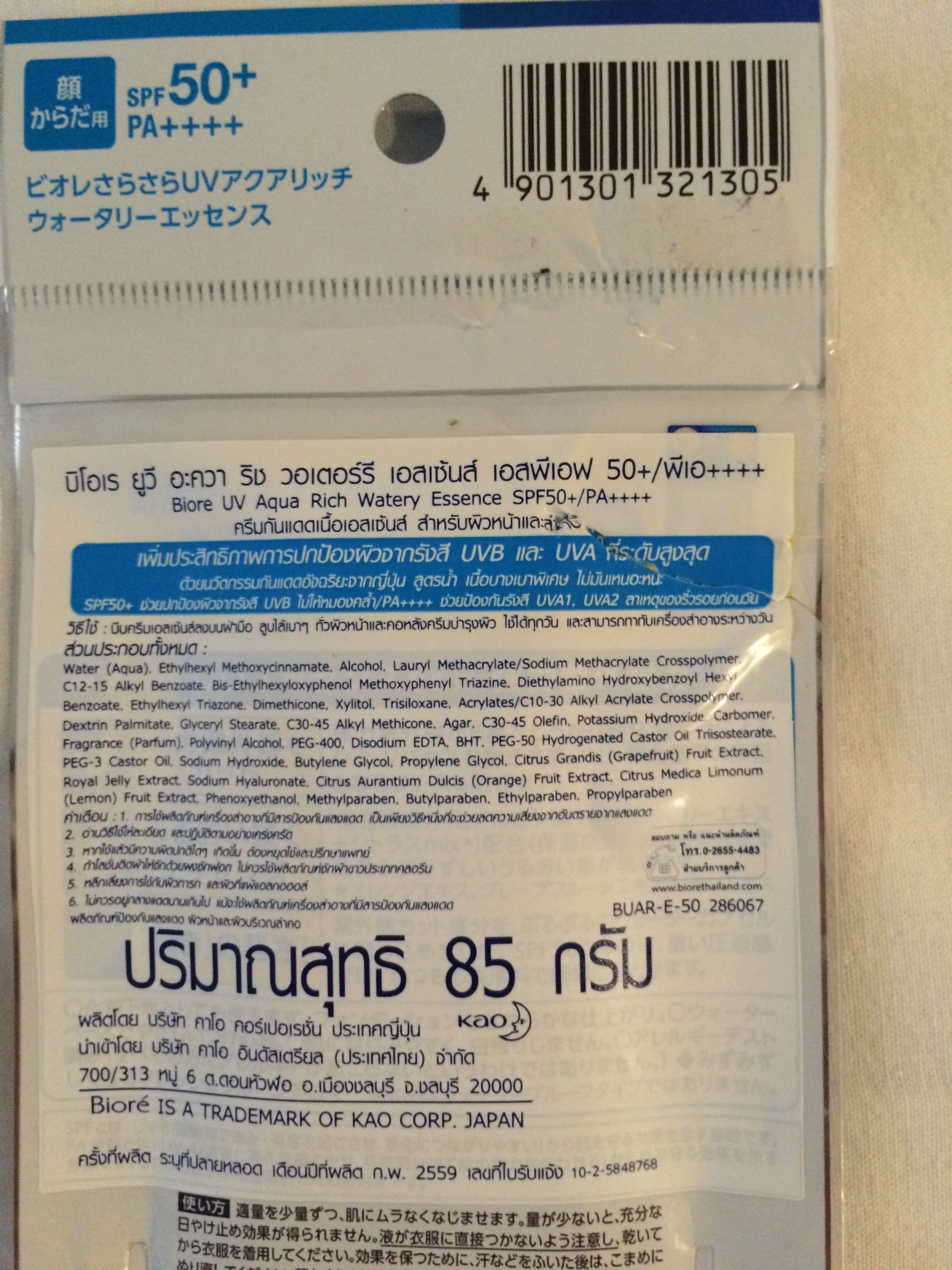 Empecemos con Bioré UV Aqua Rich Watery Essence SPF50+/PA++++. Hay muchos + que me protegen de los UVA y los UVB. Según algunos, es el mejor protector solar del mundo: sin película blanca, con una absorción óptima. ¡Es cierto, es cierto! El único punto negativo que me molesta es que el alcohol es uno de los ingredientes más importantes de esta crema. Mi piel lo siente, nada más aplicarlo, hay una especie de evaporación de alcohol que es muy desagradable. Pero en términos de protección y sensación durante un largo periodo de tiempo, voto por el SÍ. El formato grande cuesta 585 bahts (15 euros)