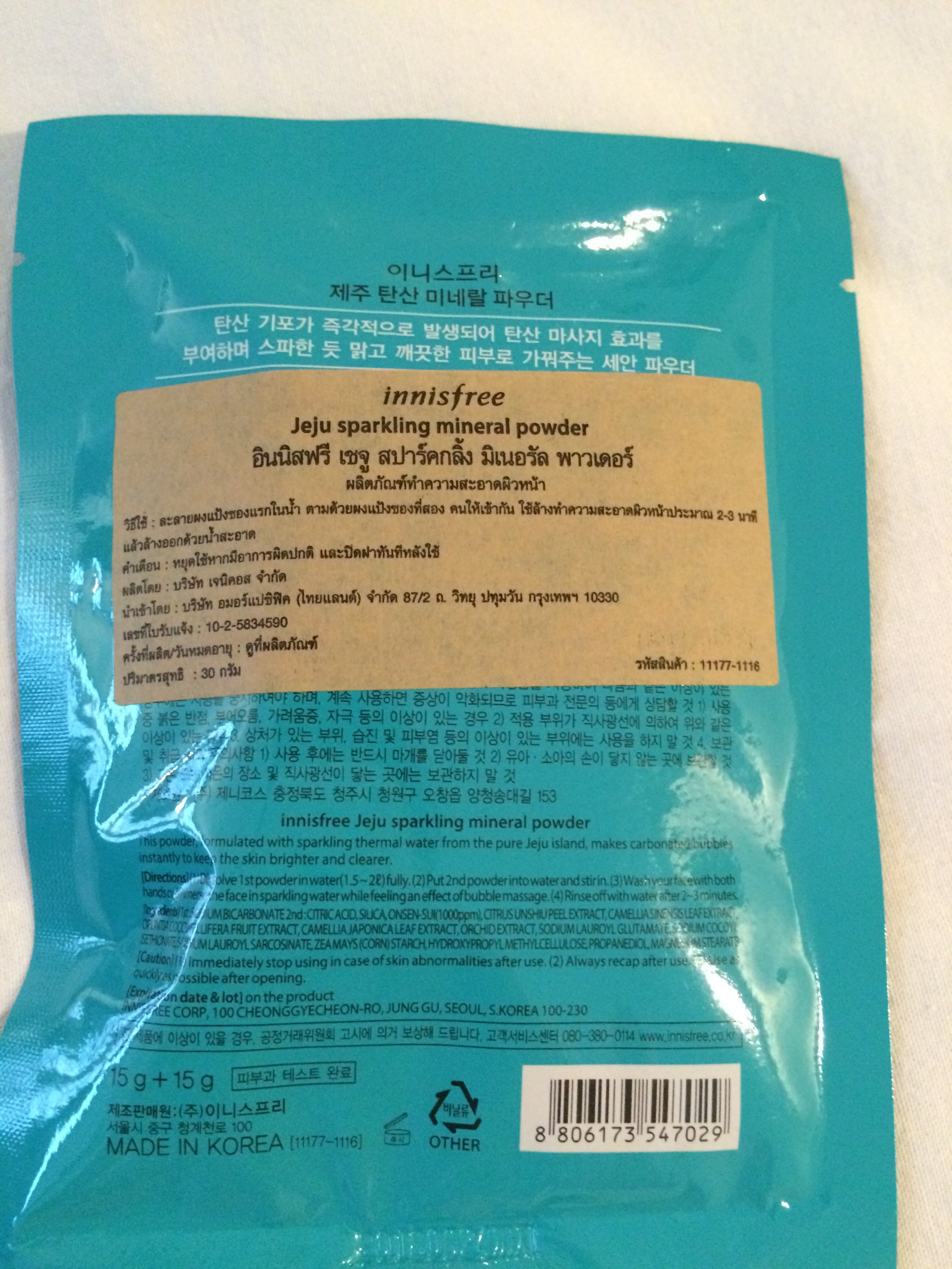 En Innisfree, me dejé tentar por este polvo que permite tomar 2L de agua termal de Jeju: polvo mineral espumoso de Jeju. Me dejé influenciar totalmente por una serie coreana patrocinada por Innisfree, en la que la heroína vende las bondades de esta agua. Tiene 2 sobres y hay que mezclar los dos sobres en agua para obtener agua con gas, que se supone que da brillo a la piel. Todavía no lo he probado, pero pienso hacerlo en las próximas semanas. El sobre cuesta 90 baht, 2,5€