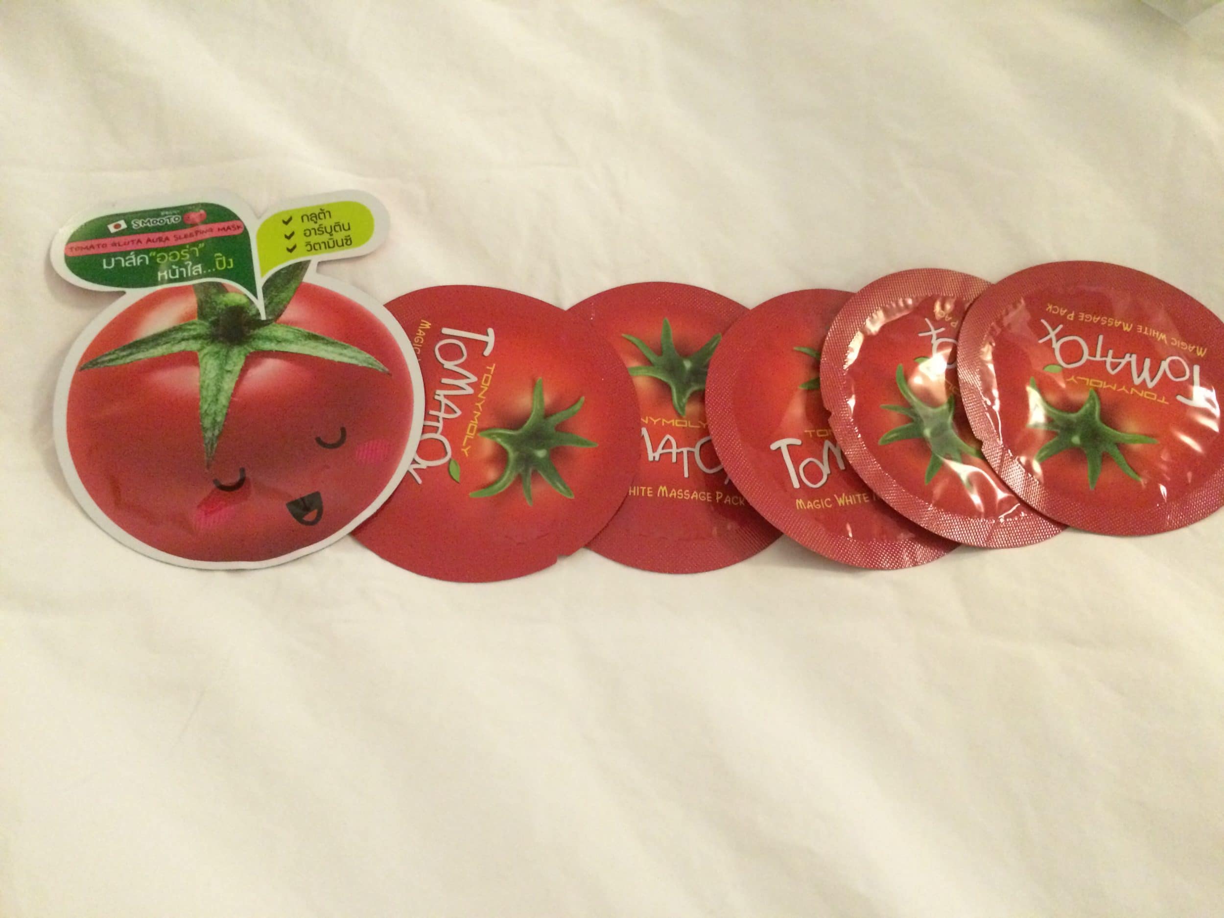 En Family Mart, encontré las famosas mascarillas de tomate de Tony Moly por 19 baht. Son muy agradables y te dan un cutis unificado en 20 minutos. También tomé la versión japonesa para comparar. Tienen muchas otras mascarillas de aloe vera.