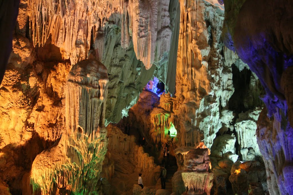 El barco atraca y visitamos la cueva sorpresa. El nombre está mal traducido, Hang Sung Sot debería traducirse más bien por la cueva «Bouche bée», tan bonita es. Es la cueva más visitada de la bahía de Ha Long. Cuando fui allí en 1993, aún no estaba iluminado. Sé que muchos turistas critican las instalaciones que se han hecho, y las luces que son un poco kitsch, pero debo asegurar que cuando lo visité sin iluminación, francamente no estaba en modo alguno en modo «embobado» porque no podía ver nada, y podía caer en un agujero y morir en cualquier momento. Así que es muy bueno, para ver su verdadera belleza, que se hayan instalado las luces. Sin embargo, critico la elección de la luz (no es necesario que haya luces rojas/azules, habría bastado con una luz normal)