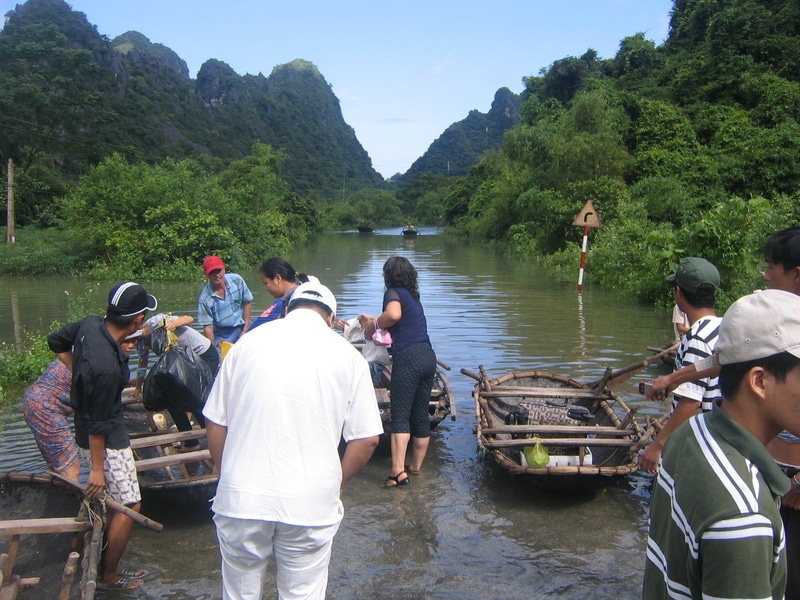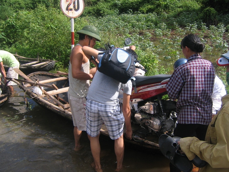 Pero hay que confiar en el ingenio y la perspicacia empresarial de los vietnamitas. Varios lugareños han detectado el problema y llegan, de la nada, con su barca de bambú, dispuestos a transportar a los turistas, el equipaje y la moto. Son cargos adicionales para nuestra agencia, pero no nos cobran a nosotros. Nuestro guía llama a su agencia para validar el presupuesto adicional, mientras nosotros disfrutamos de este paseo improvisado, encantados de hacerlo en el corazón del bosque 😀