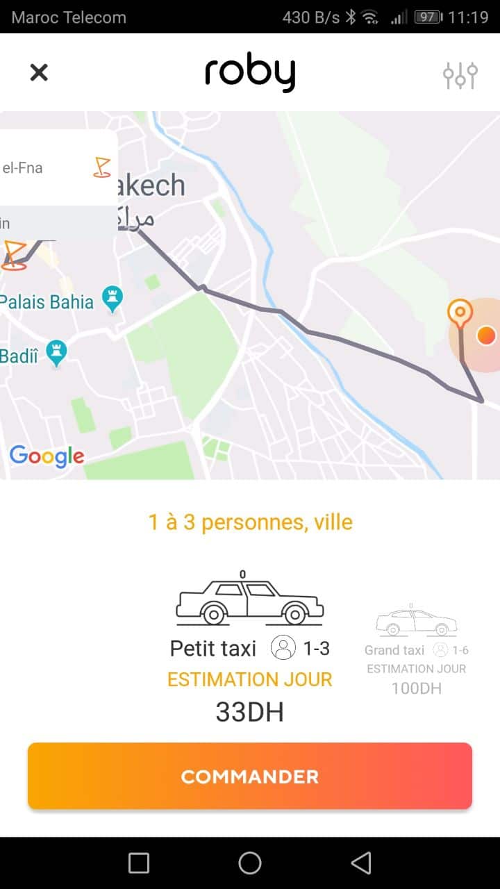 Según un conductor con el que hablamos, hay unos 200 taxis que utilizan Roby en Marrakech. Cuando un taxista quiere utilizar Roby, obtiene 2 meses gratis y luego tiene que pagar 500 dh al mes.