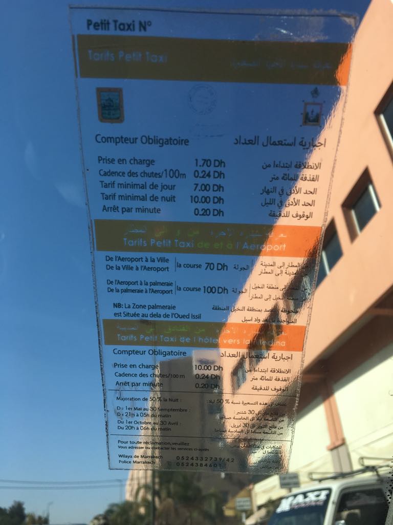 Otro ejemplo: cuando llegamos a la estación CTM de Marrakech desde Essaouira, el primer taxi que se acercó a nosotros nos pidió ¡80 dh! Cuando nos negamos, bajó a 50 dh. Finalmente paramos un taxi que circulaba unos metros más allá, accedió a poner el taxímetro. Precio del viaje: 16 dh.