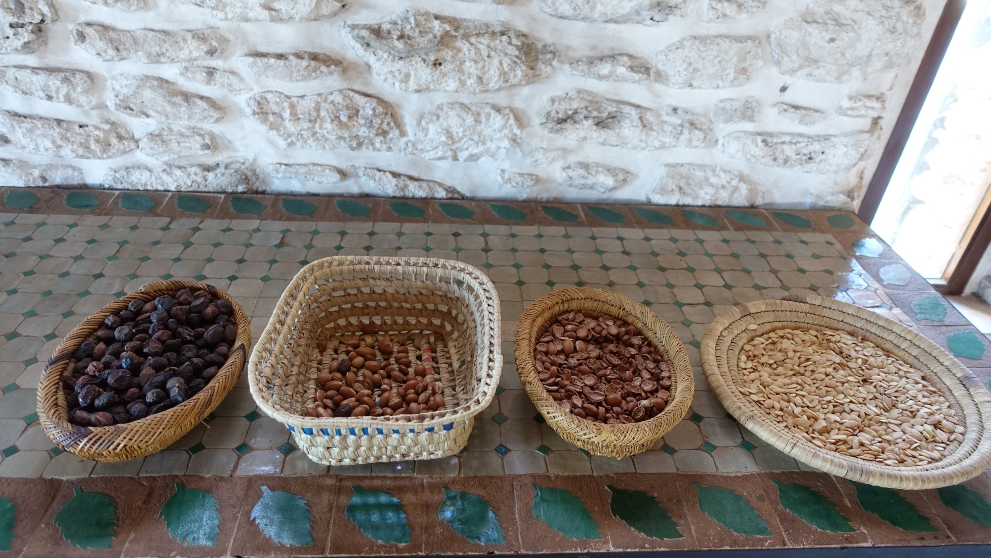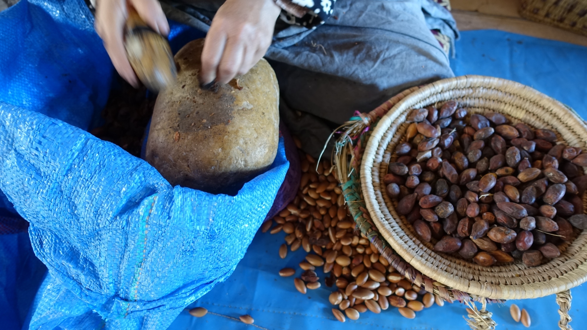 Antes, parte del trabajo lo hacían las cabras, que se comen el fruto y rechazan la nuez. Pero olía demasiado a excrementos de cabra, así que ahora las cooperativas rompen las nueces a mano. Esta es la primera tuerca que se rompe. Las mujeres vienen aquí con sus nueces cuando quieren y se les paga por kilo. Así que se organizan como quieren.