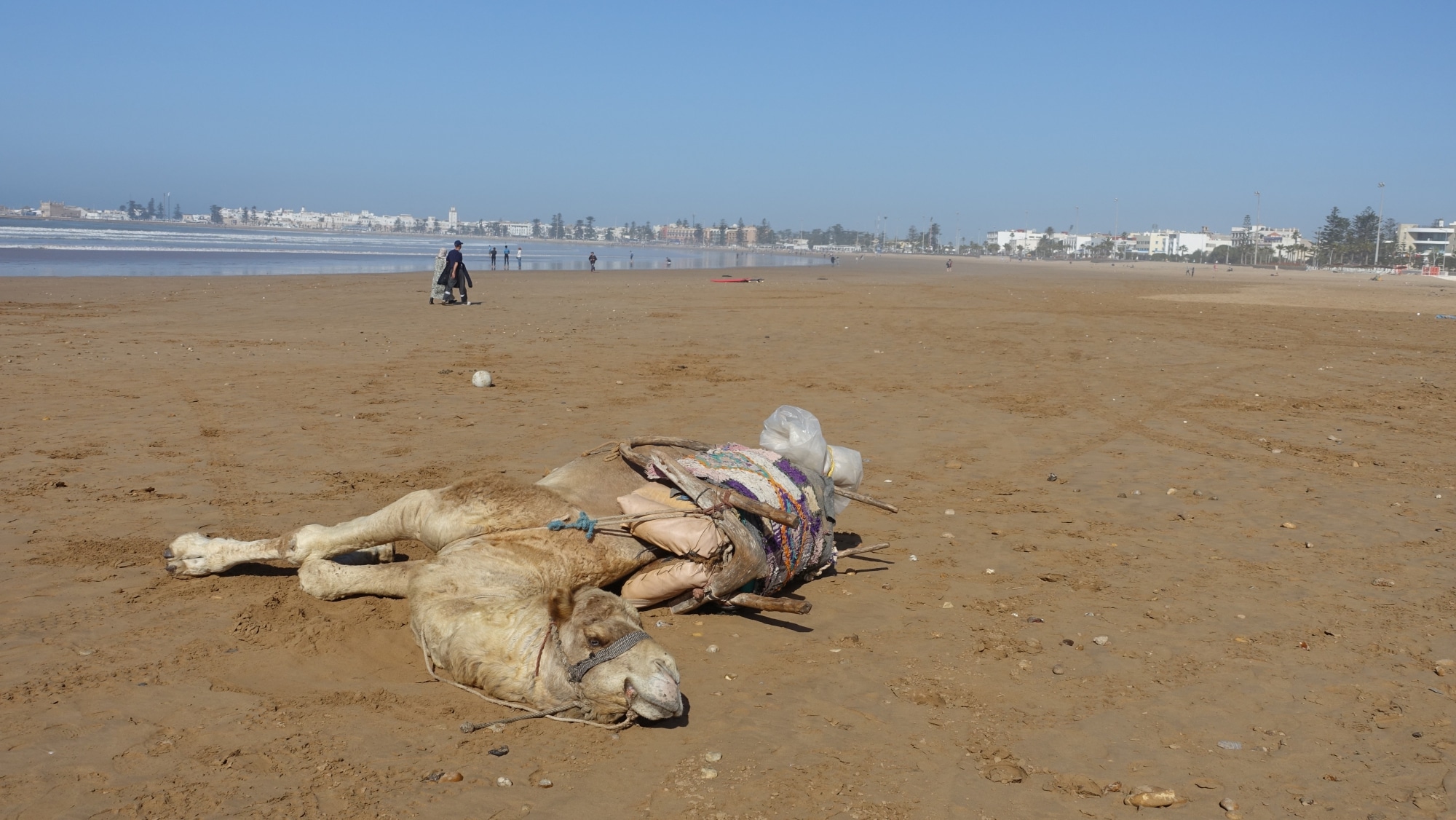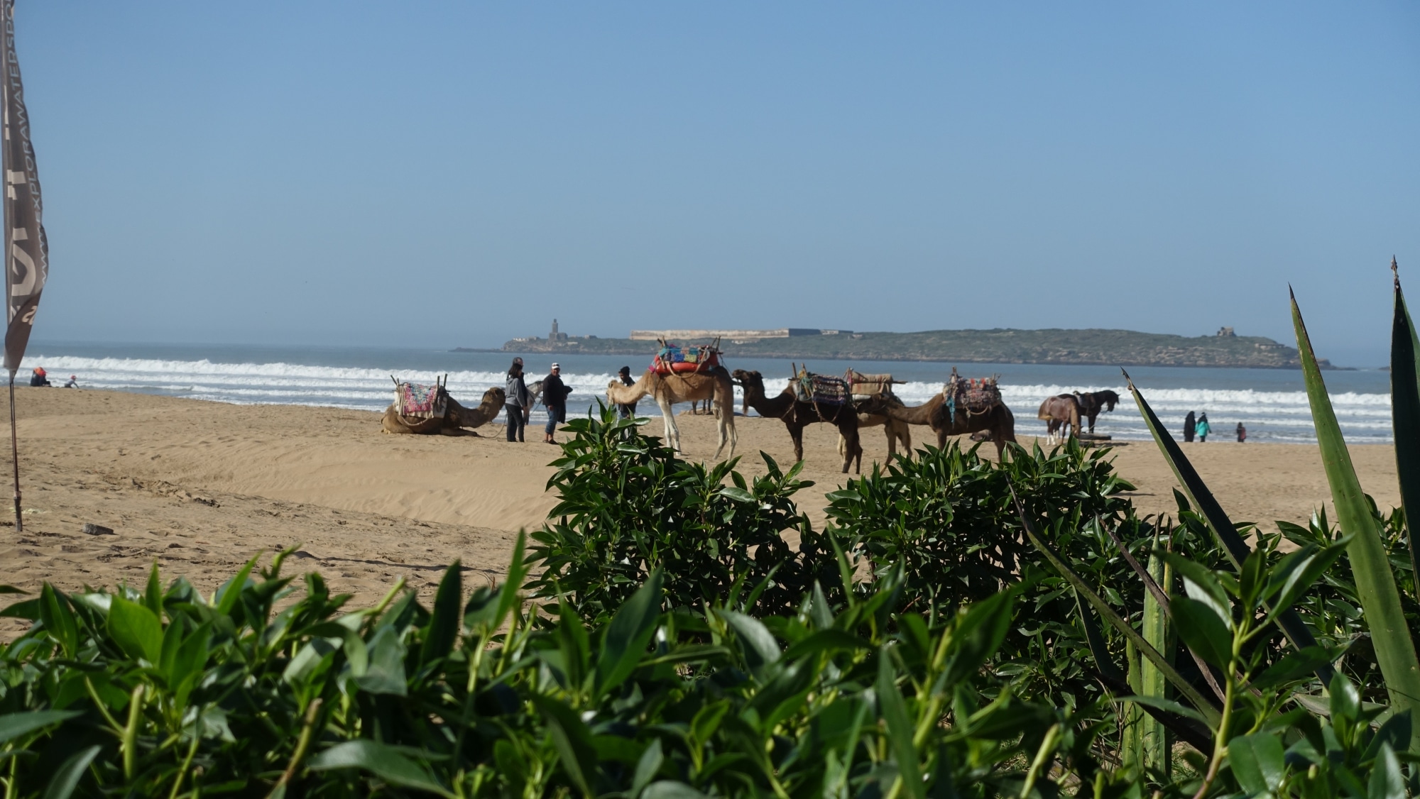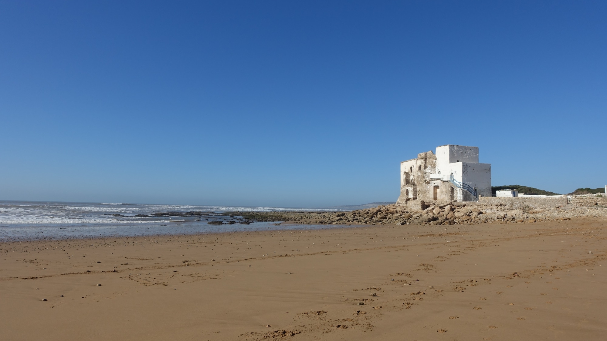 Volvemos a tomar la carretera para ir a Sidi Kaouki, una playa enorme y aún menos concurrida que la de Essaouira. Aquí hay algunos restaurantes junto a una villa abandonada, un camping casi en la playa y algunos servicios: paseos a caballo, en camello, en quad… El viento sopla más fuerte aquí y los surfistas, creo, preferirán esta playa.