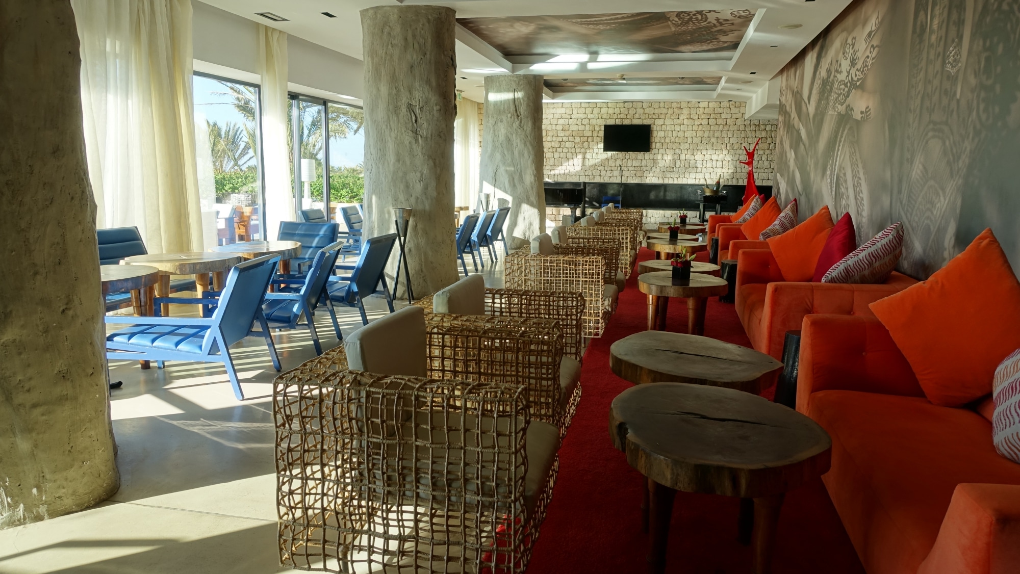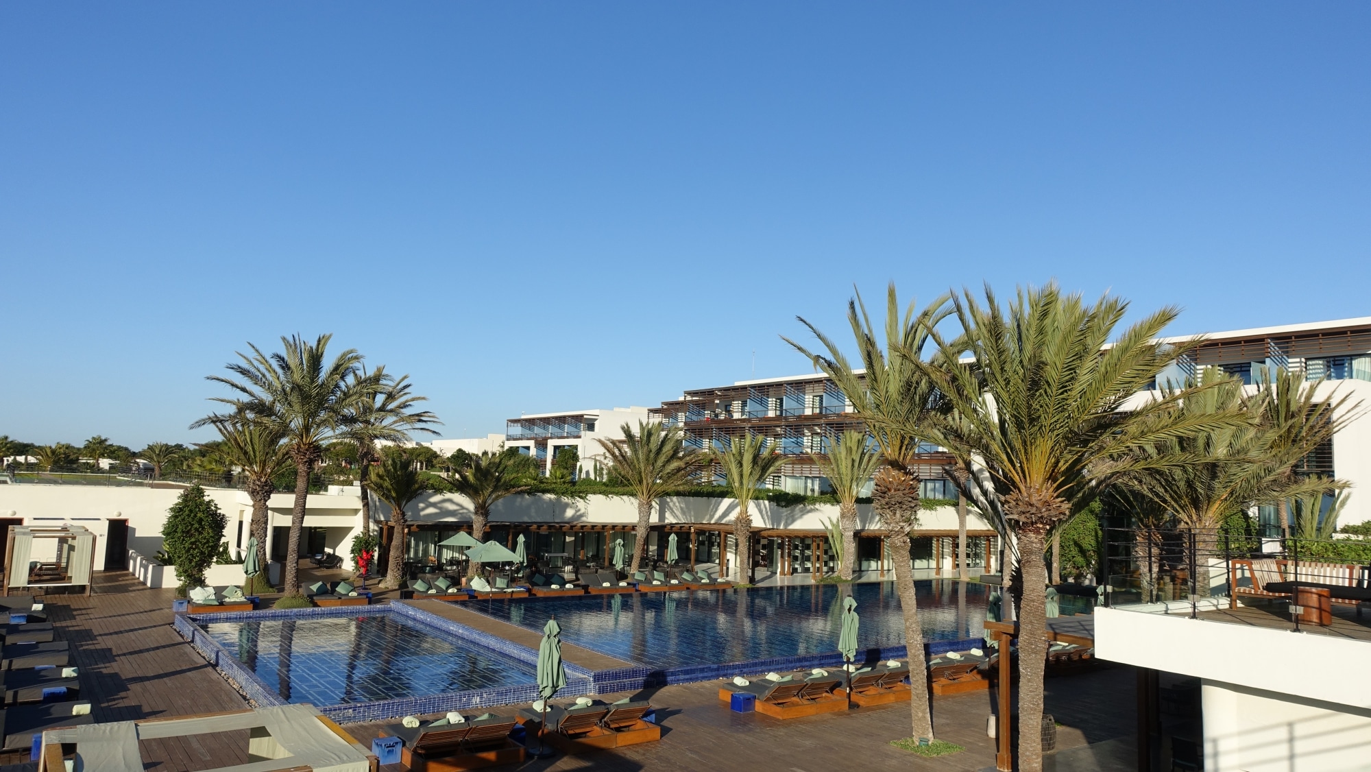 En cambio, elegimos sentarnos aquí en la terraza, que tiene vistas a las piscinas y al campo de golf. Nos acompañan pequeños pájaros. Podríamos haber bajado a tomar el mojito, tumbados en las tumbonas de la piscina, pero la vista es más bonita desde aquí. De memoria, no es demasiado caro, puedes optar por un té a la menta por 30dh (3€) o una Coca-Cola (4€).