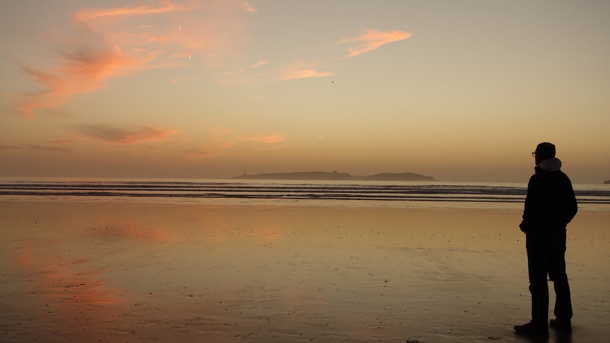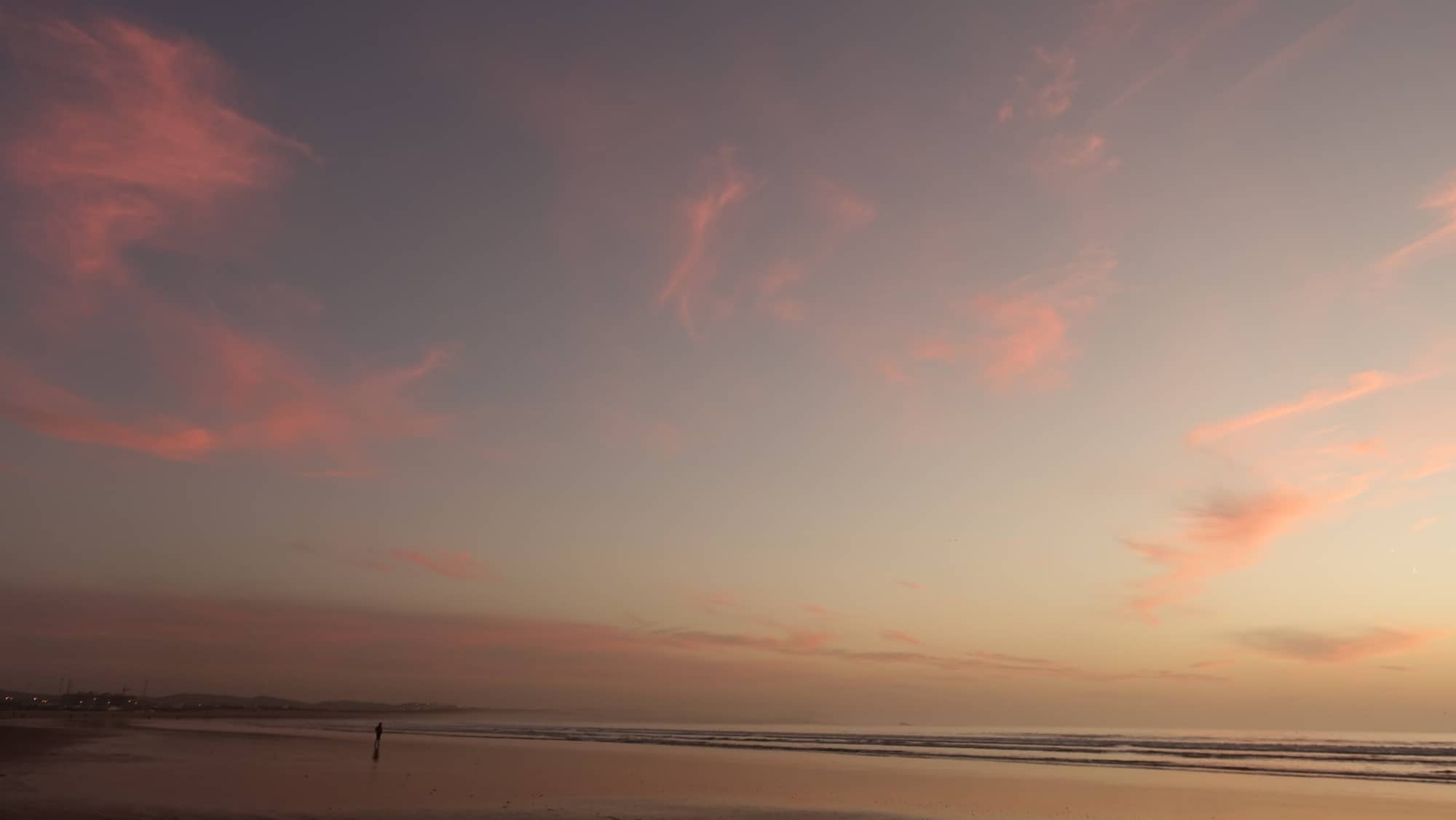 Aunque llevamos 3 semanas en Essaouira, es la primera vez que nos tomamos el tiempo de ir a ver la puesta de sol en la playa. Hoy, hay un poco de nubes, pero el espectáculo sigue siendo genial. Seguro que encontraremos otros momentos sin nubes para batir el récord de belleza de la puesta de sol que hemos visto en Uruguay