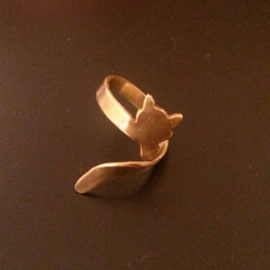 Temiendo no ser bueno, empecé con tres horas de clase. Normalmente, la primera clase es hacer una medalla, pero como no llevo grandes joyas, he preferido hacer un pequeño anillo en forma de gato, sin soldar. Iris me ayudó a realizar mi idea de un anillo y me guió paso a paso. El latón se proporciona e incluye en el precio del curso, así que mi primer anillo fue de latón.