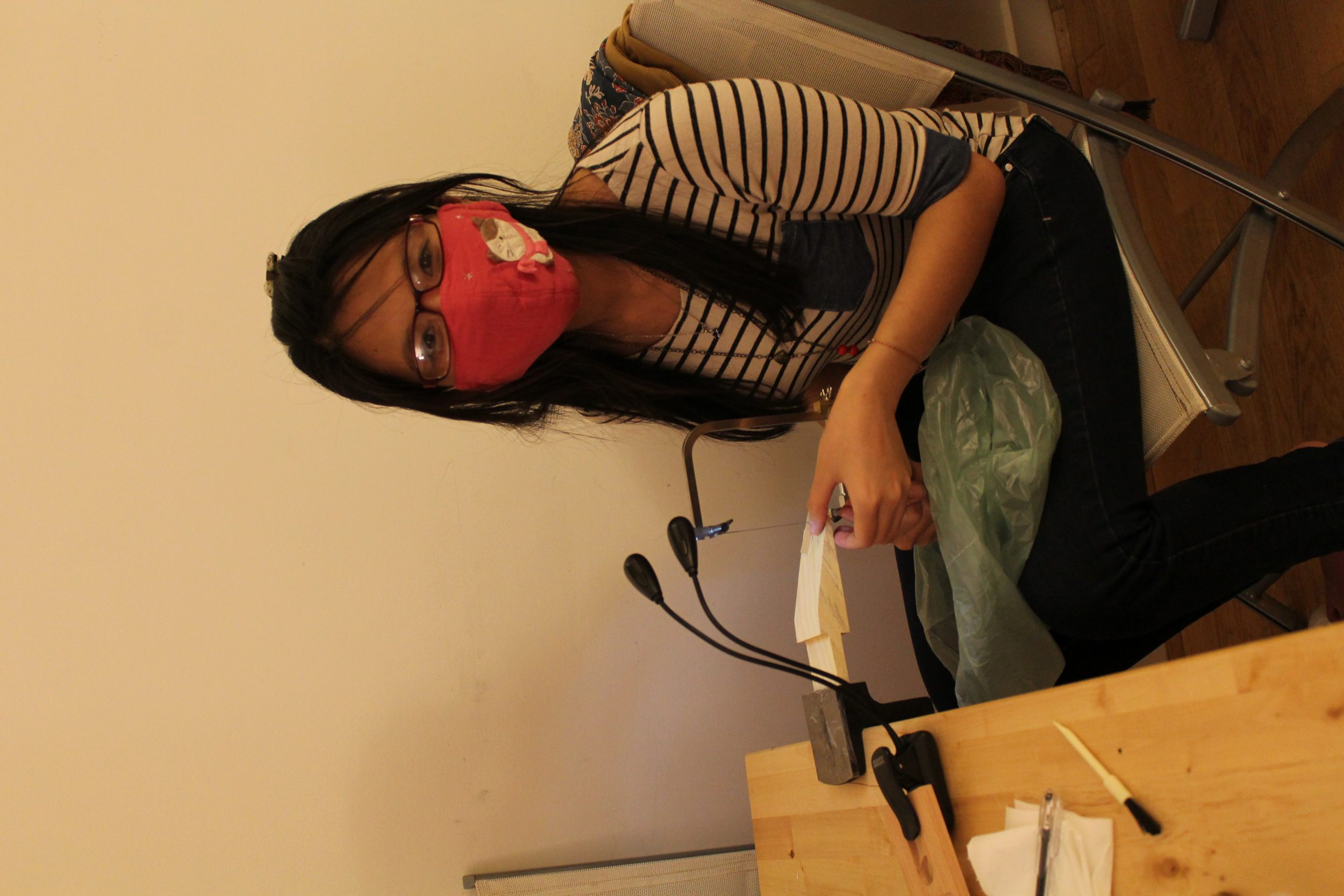 Las tres horas pasaron muy rápido. Aprendí a utilizar el bocfil (una herramienta que parece una sierra, para cortar metal). Puedes ver en la foto que he cortado la oreja del gato un poco de más. Fui extremadamente lento al cortarlo, pero aun así conseguimos pulirlo todo a tiempo.