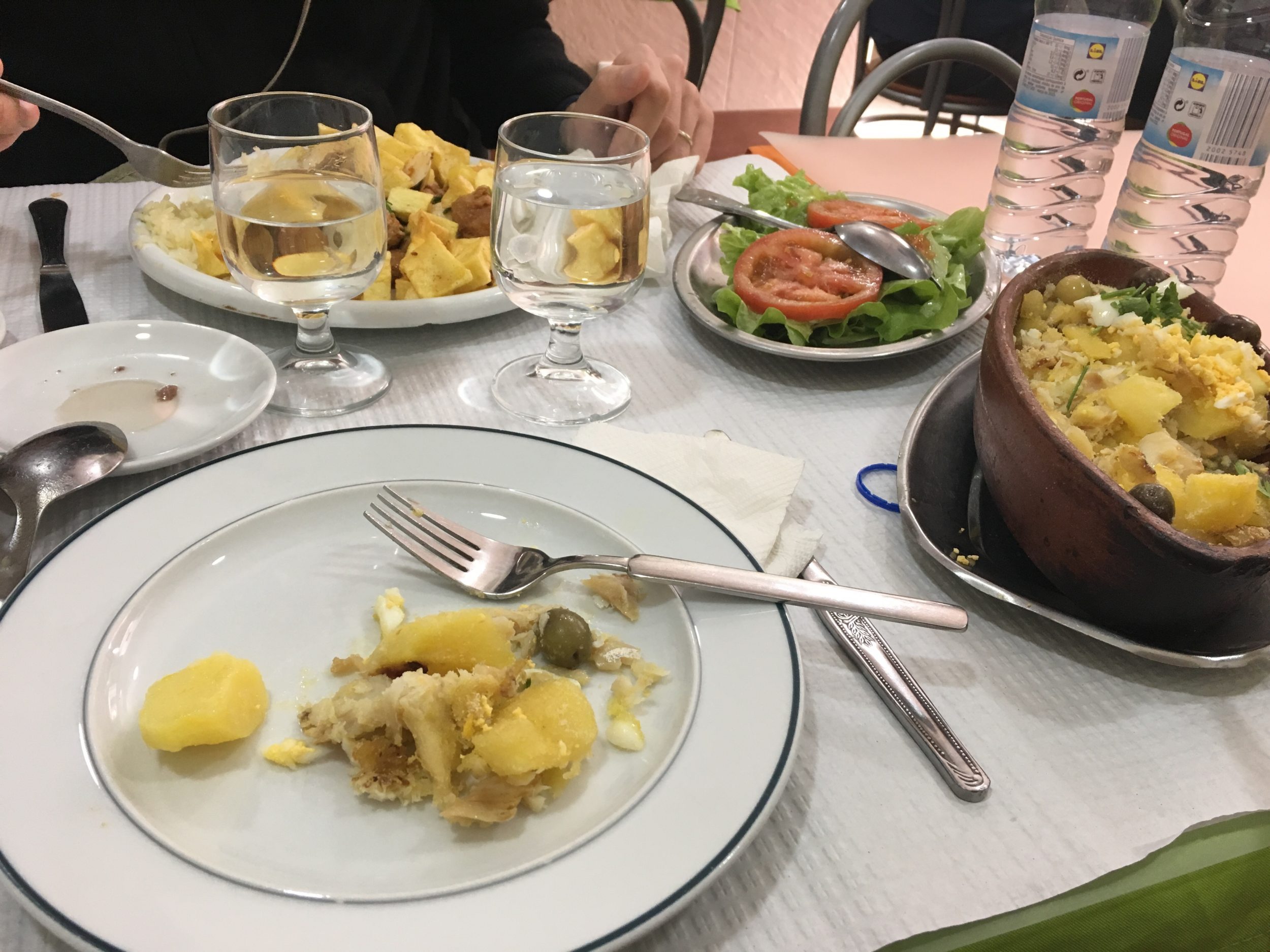 Nos trae dos sopas, dos bebidas, dos platos: uno a base de bacalao, otro a base de pollo. ¡Qué bonito! A continuación los postres e incluso el café si queríamos. 7,5€/persona ! Recetas típicas portuguesas, tradicionales.
