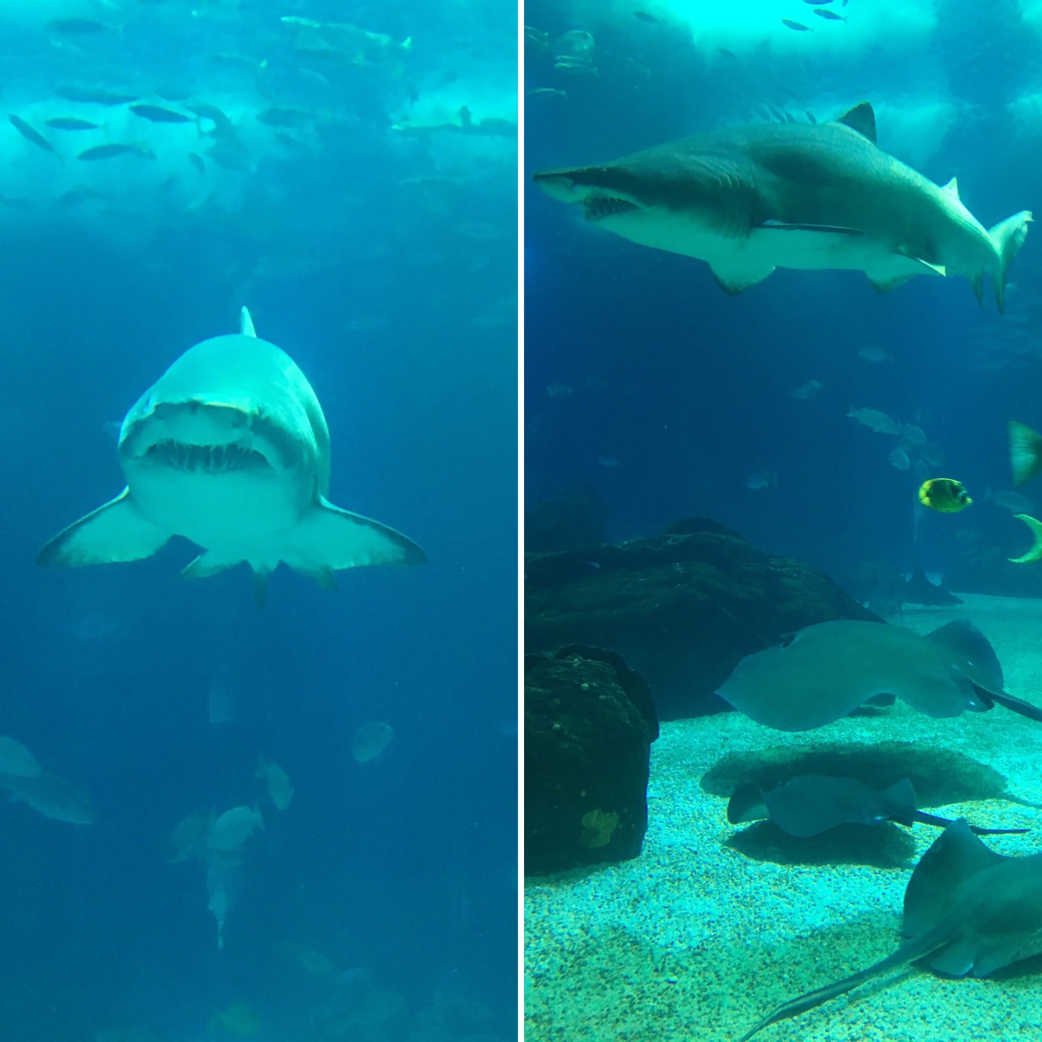 Continuamos la visita en otro edificio, que consta de un enorme acuario y 4 acuarios más pequeños. El acuario central está dividido en varias partes (hábilmente separadas por enormes rocas), con agua a diferentes temperaturas, lo que nos permite observar pingüinos, y a lo lejos tiburones… Se puede observar el acuario en 2 plantas y desde pequeños rincones tranquilos..