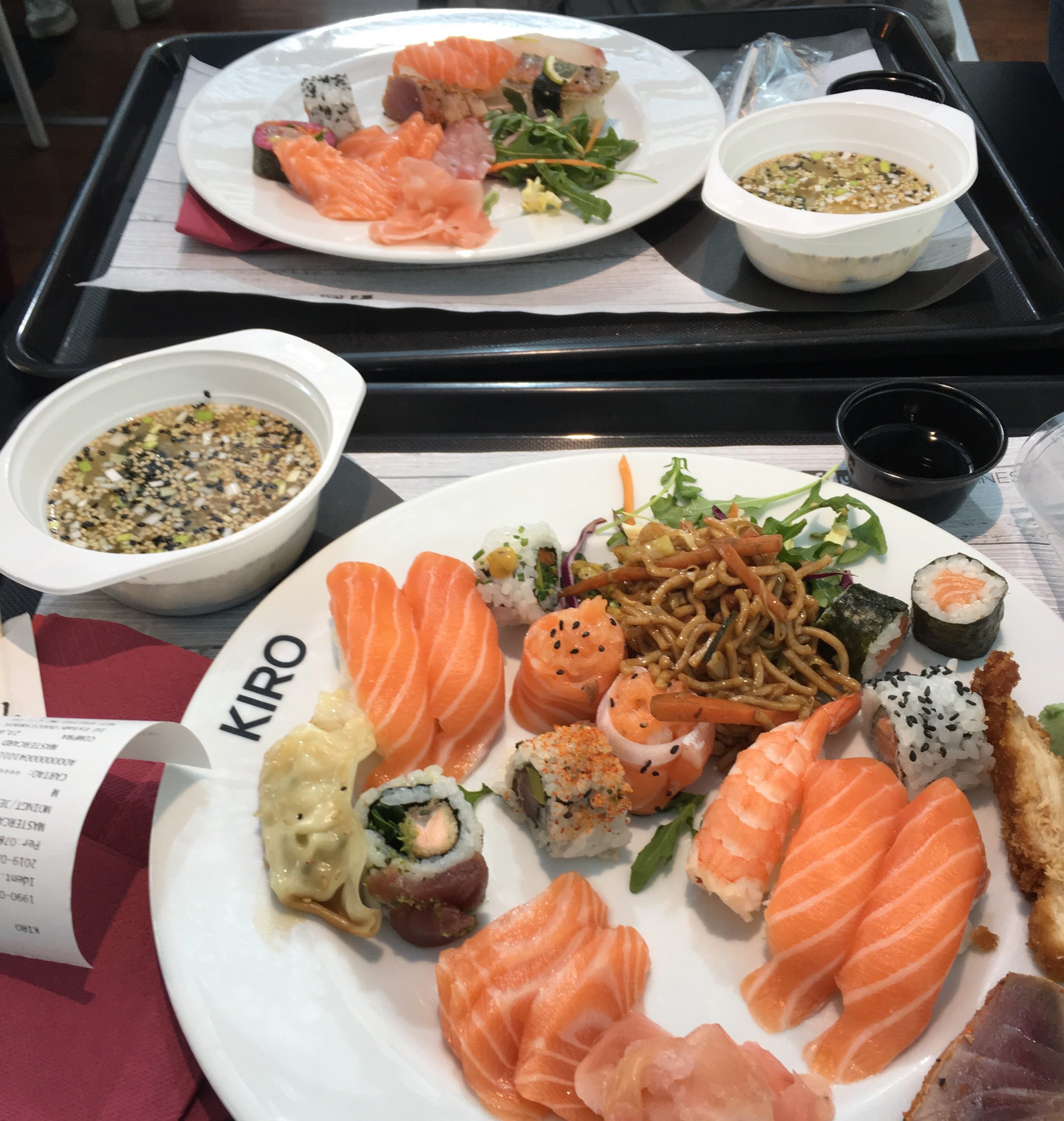 Elegimos almorzar en la planta superior, donde se puede elegir y pagar el sushi al peso (2,90 euros por 100 gramos). Tenemos 24€ para dos, es fresco y muy bueno. ¡Lo valido!
