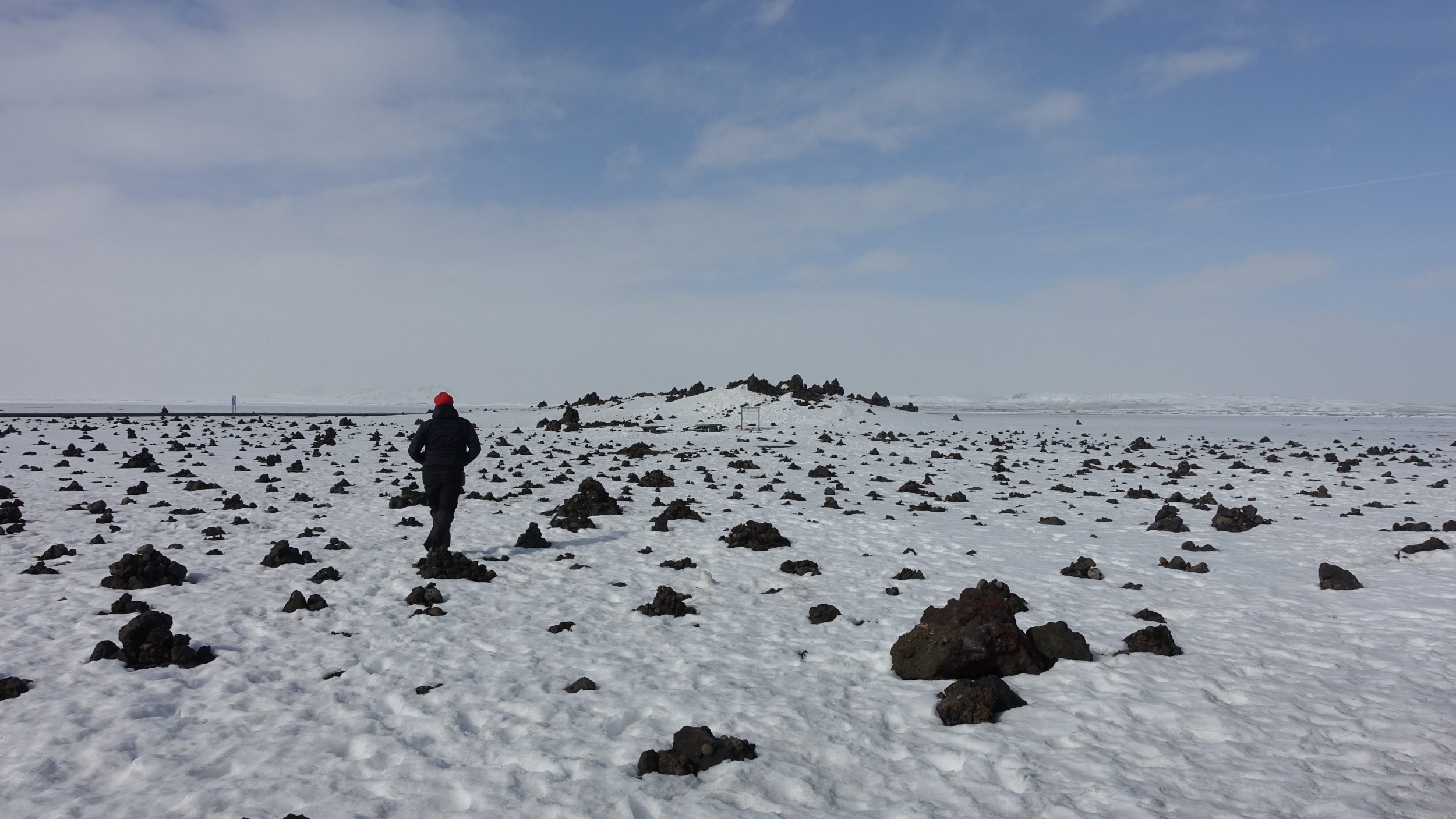 Llegamos a Laufskálavarða, un montículo de lava. Hay un aparcamiento a un lado de la carretera y podemos ver montones de piedras amontonadas. Al parecer, tienen que estar amontonados así, cuando vamos allí por primera vez, para que el viaje vaya bien. Muchos turistas aprovechan este paisaje de ensueño para tomar un tentempié (hay incluso 2 mesas de picnic en medio de la nieve)