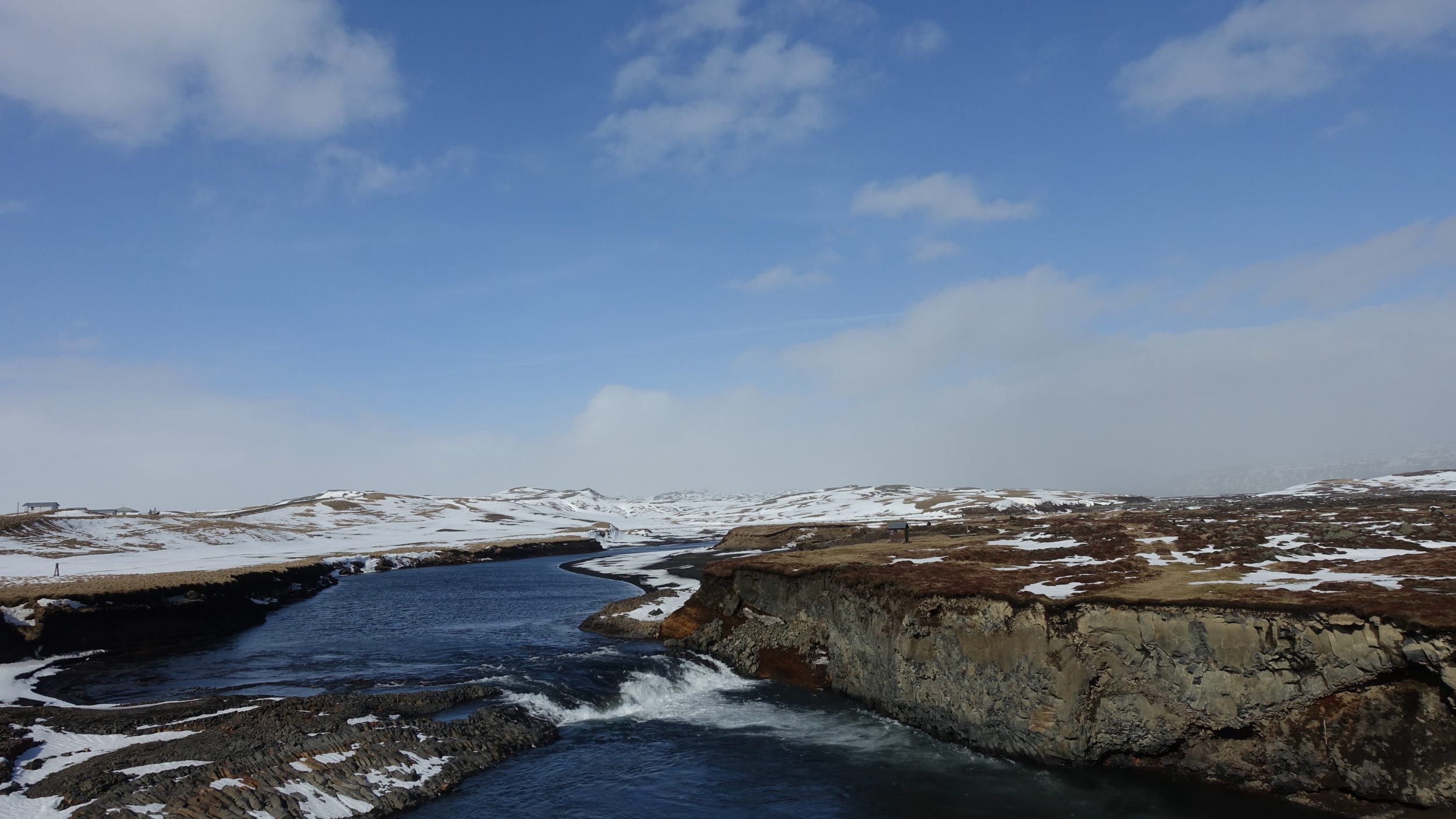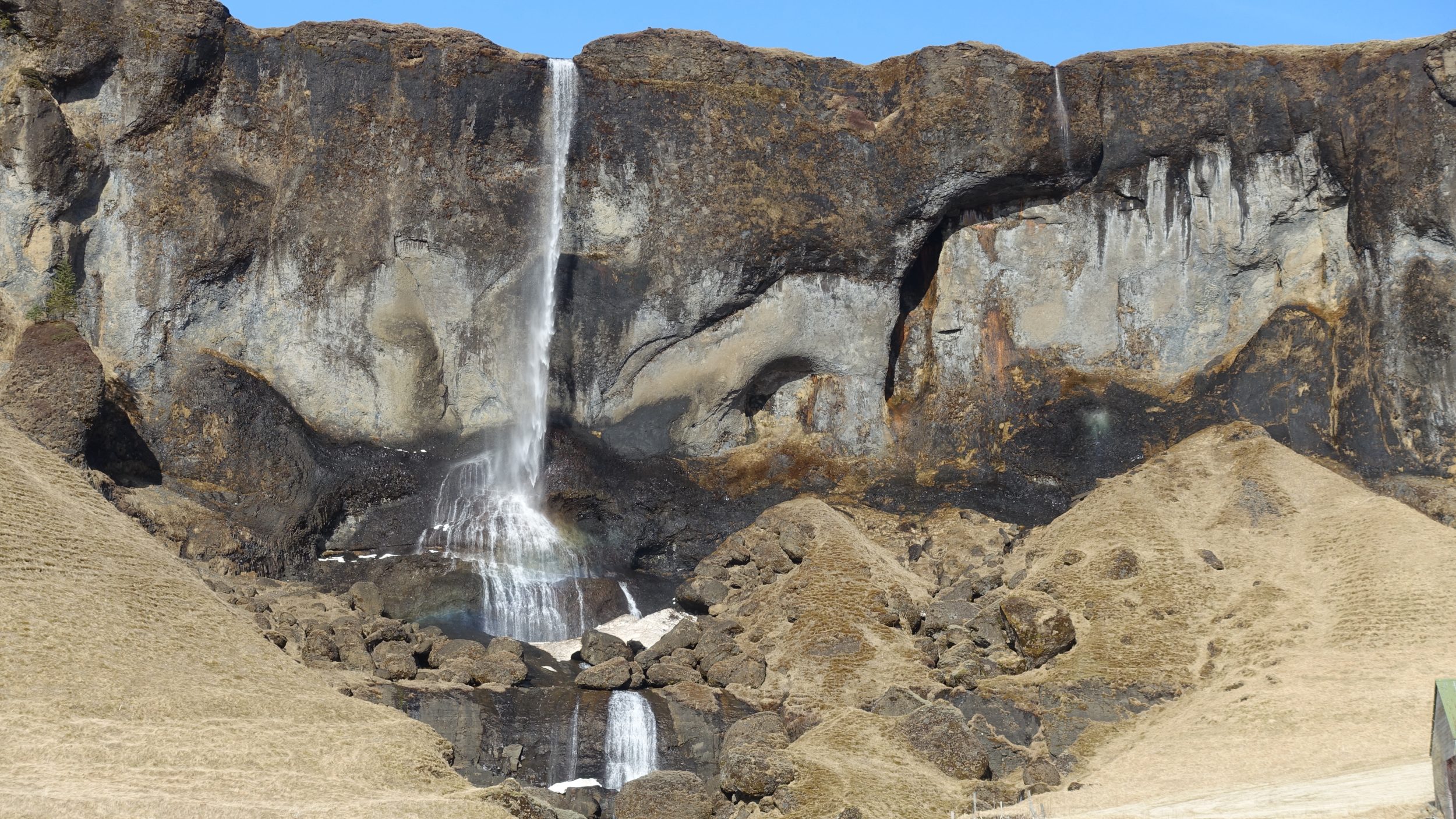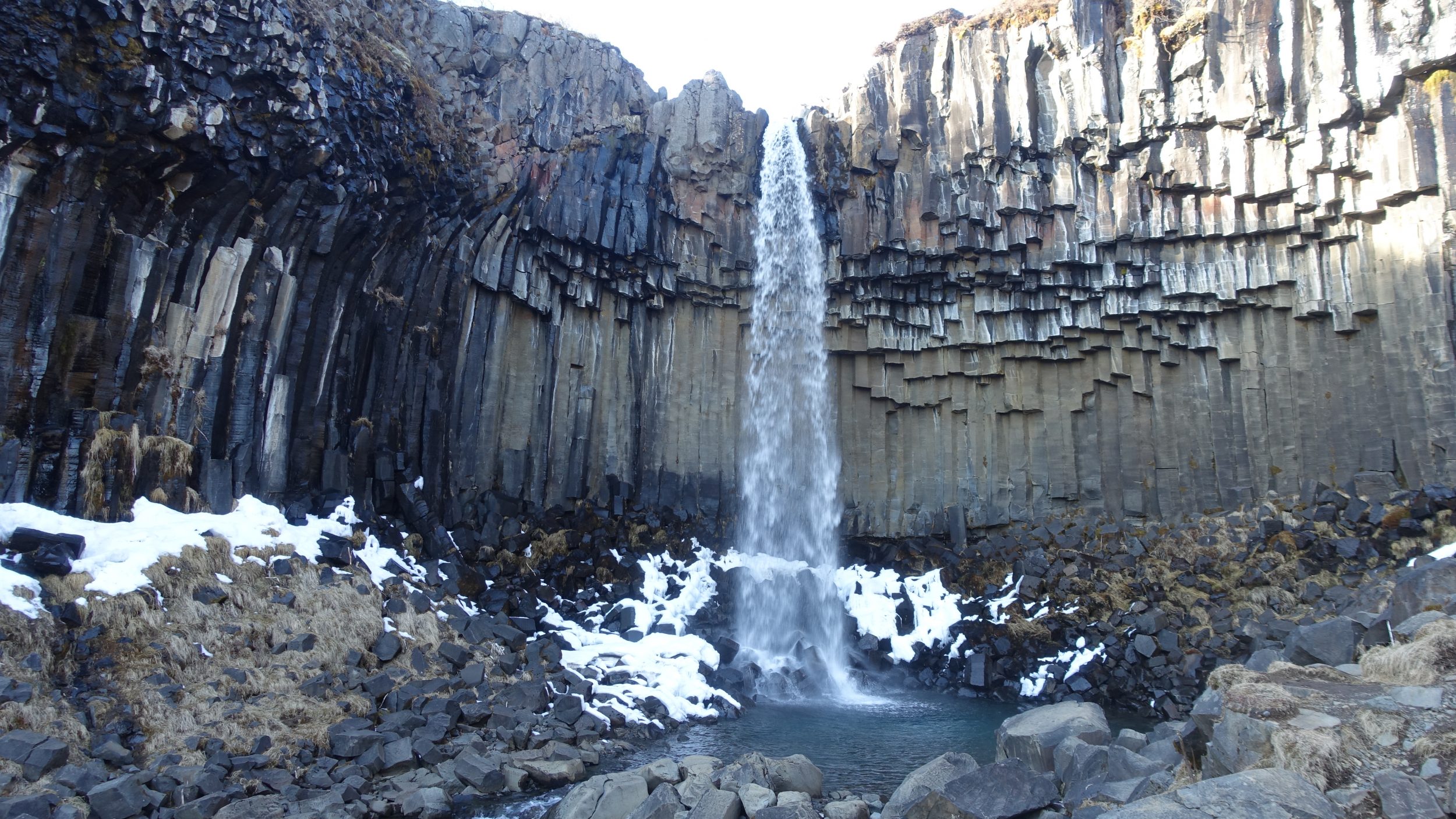 La vista desde abajo es muy satisfactoria. No podemos acercarnos a la cascada, hay una plataforma desde donde la admiramos. Pero es tan grande que nos lo llevamos a los ojos (es aún más bonito que en las fotos). Aquí vemos los órganos basálticos como los que vimos esta mañana en la playa de arena negra, pero hay trozos que se cayeron (como en Jeju), ¡es demasiado bonito! Esta cascada inspiró la arquitectura de la catedral de Reikiavik.