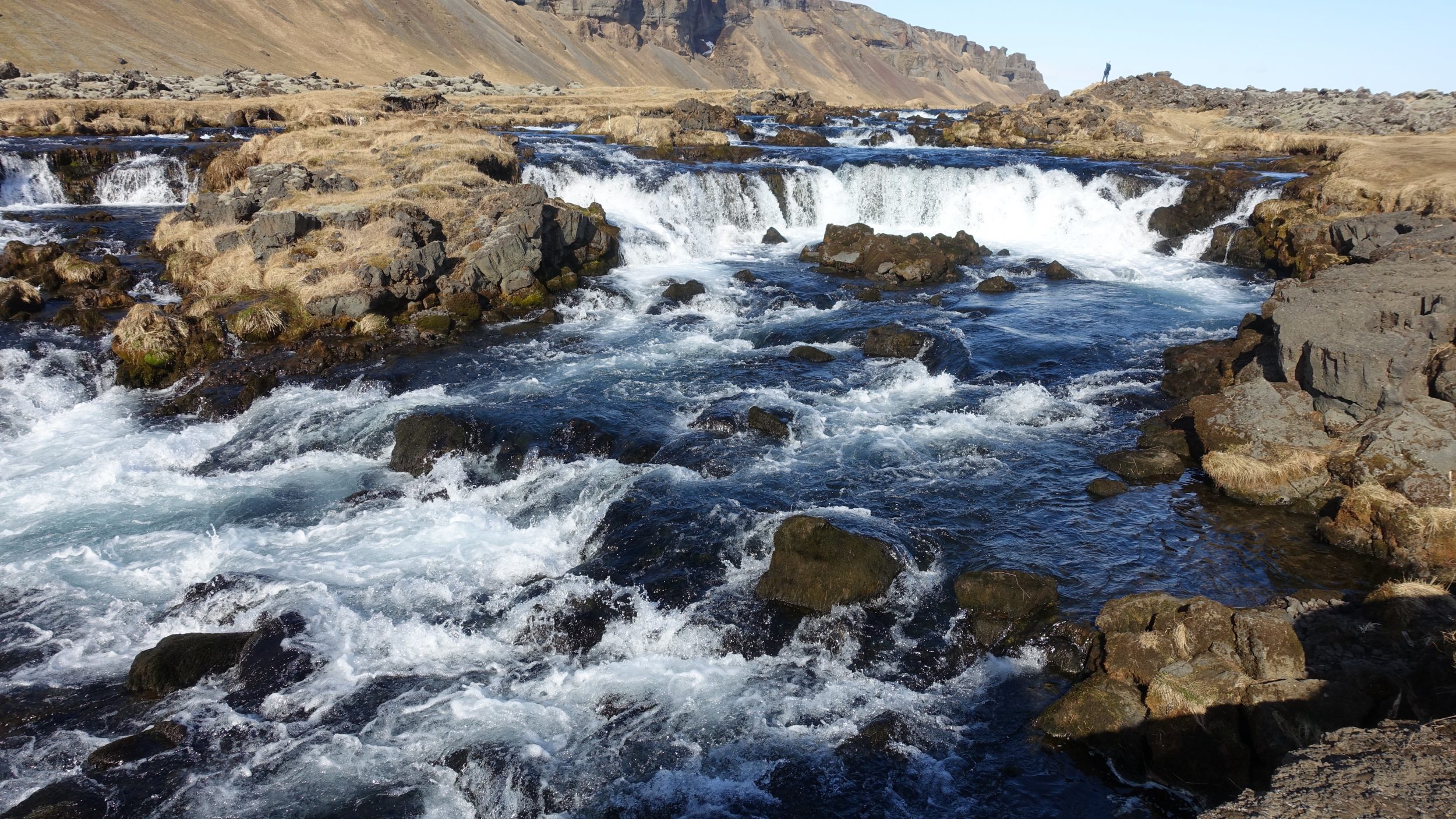 Pequeña parada fotográfica para admirar la belleza de esta cascada: Systrafoss, justo al lado de la carretera. Se divide en dos. Systra significa «hermanas». Se puede seguir una ruta de senderismo para llegar al lago de arriba, que alimenta la cascada. No lo hicimos porque queremos estar a las 4:00 en el Parque Nacional de Skaftafell, que está a una hora de aquí
