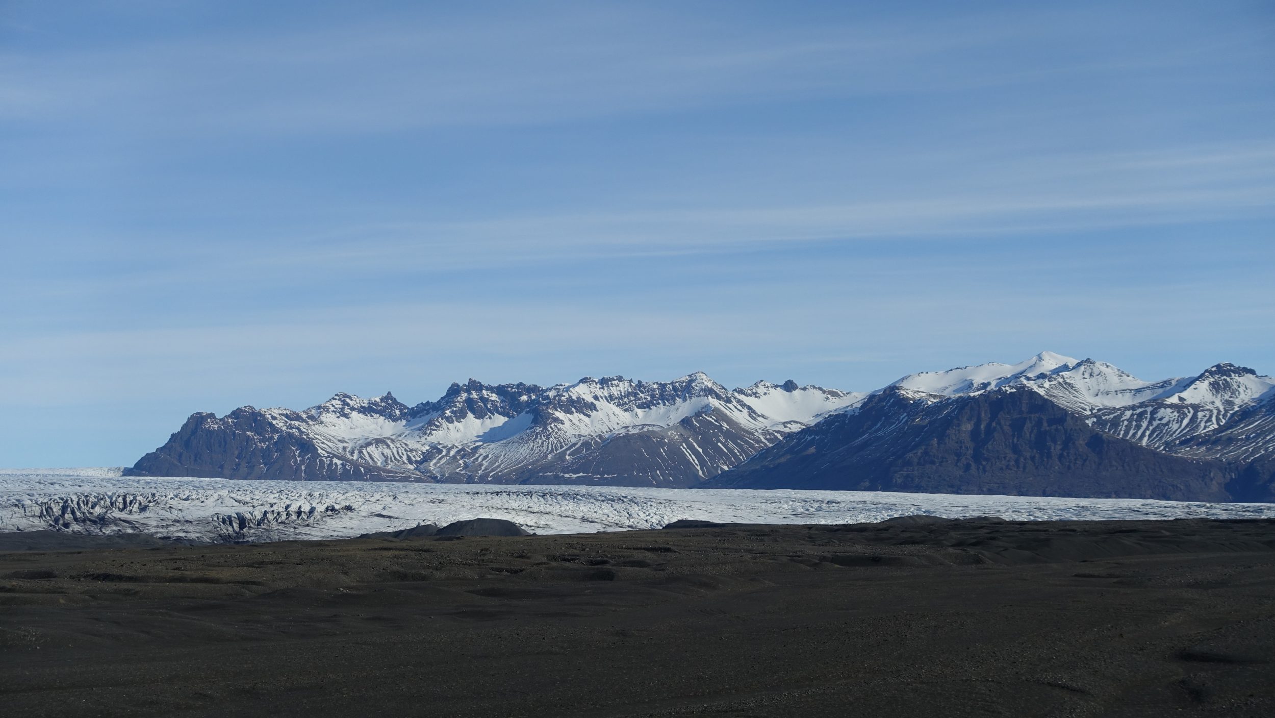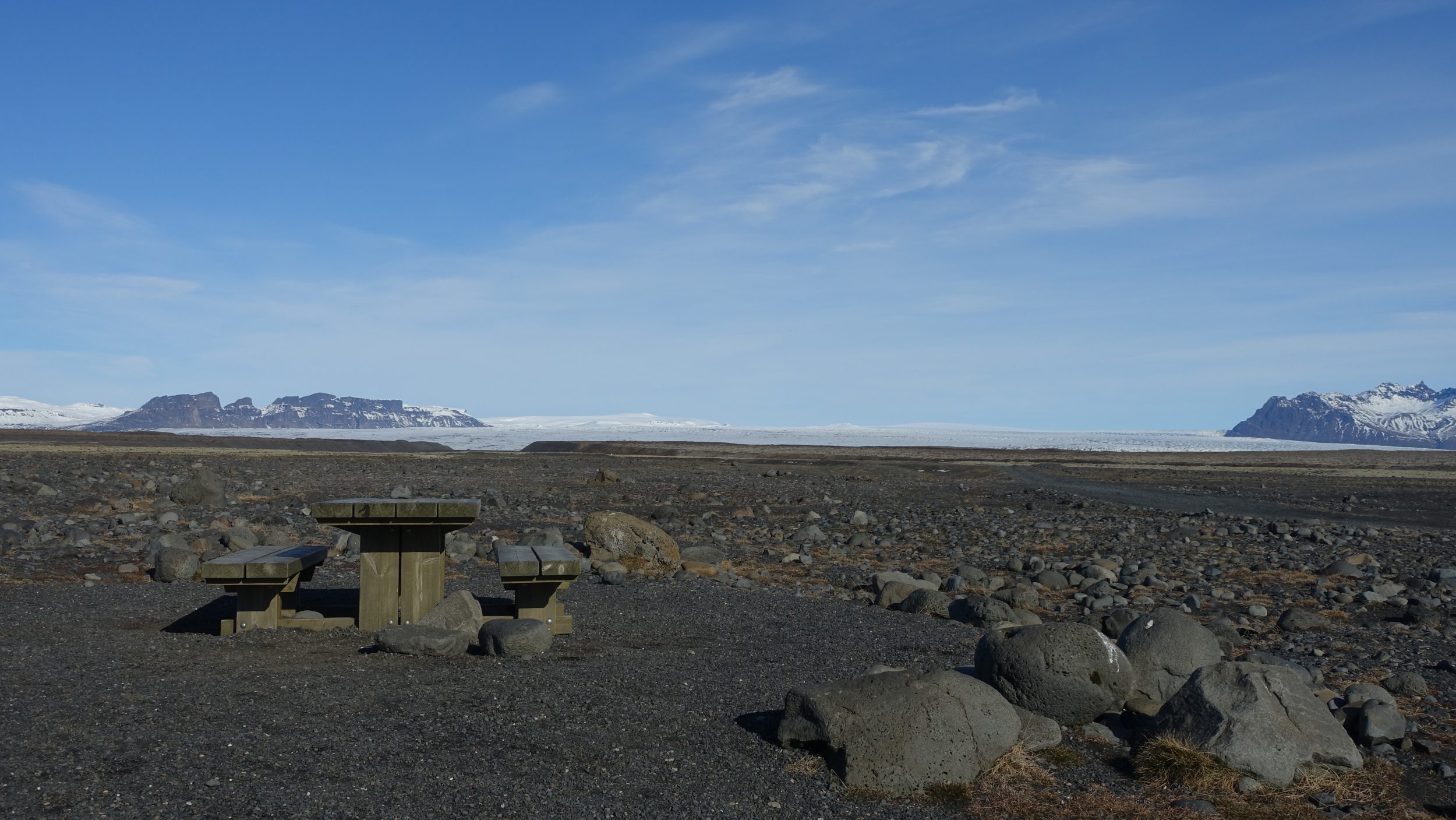 Vatnajökull es la mayor capa de hielo de Islandia. Es el segundo glaciar más grande de Europa. Y puedes ver lo grande que es sólo con acercarte. Busca Haoldukvisl en Google Maps, verás esta mesa de picnic, tan bien situada y a lo lejos, un trozo de Vatnajökull. Hasta donde alcanza la vista