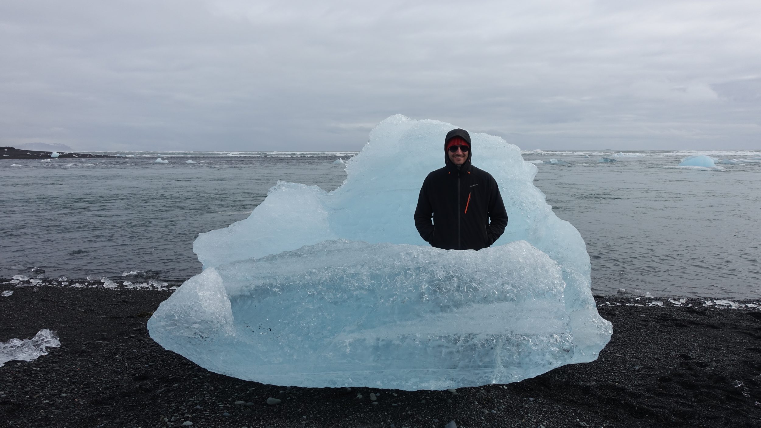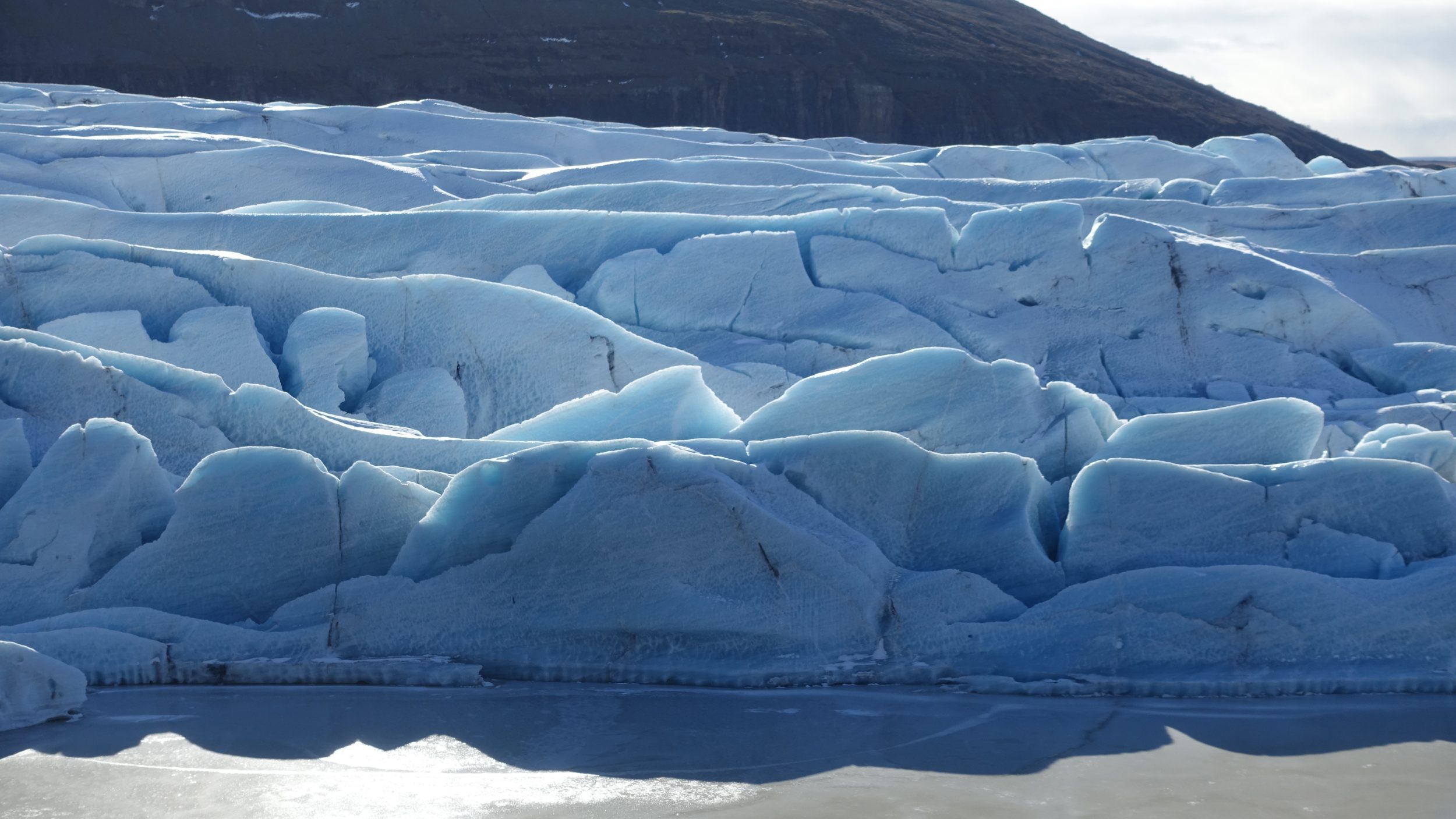 Al llegar al lugar, como muestran las fotos, el sol está en la cita y podemos ver el color azul del glaciar. Se forma una laguna debido al deshielo de los icebergs y notamos que la superficie está un poco congelada. La pureza de este glaciar me deja sin palabras, sólo hay algunos icebergs ennegrecidos por la lava, el resto es azul.