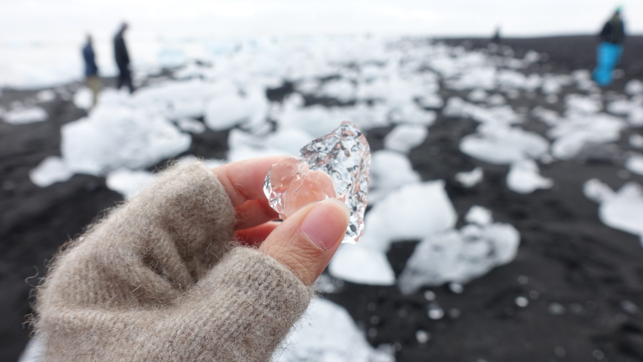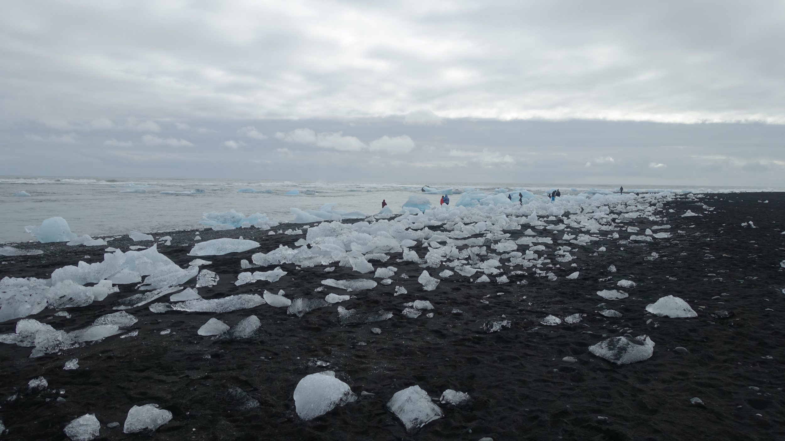 Volvemos a cruzar el puente para ir a la playa llamada Diamond Beach. Los icebergs encallan aquí, el blanco de los icebergs contrasta con el negro de la arena, ¡es precioso! Parecen diamantes.