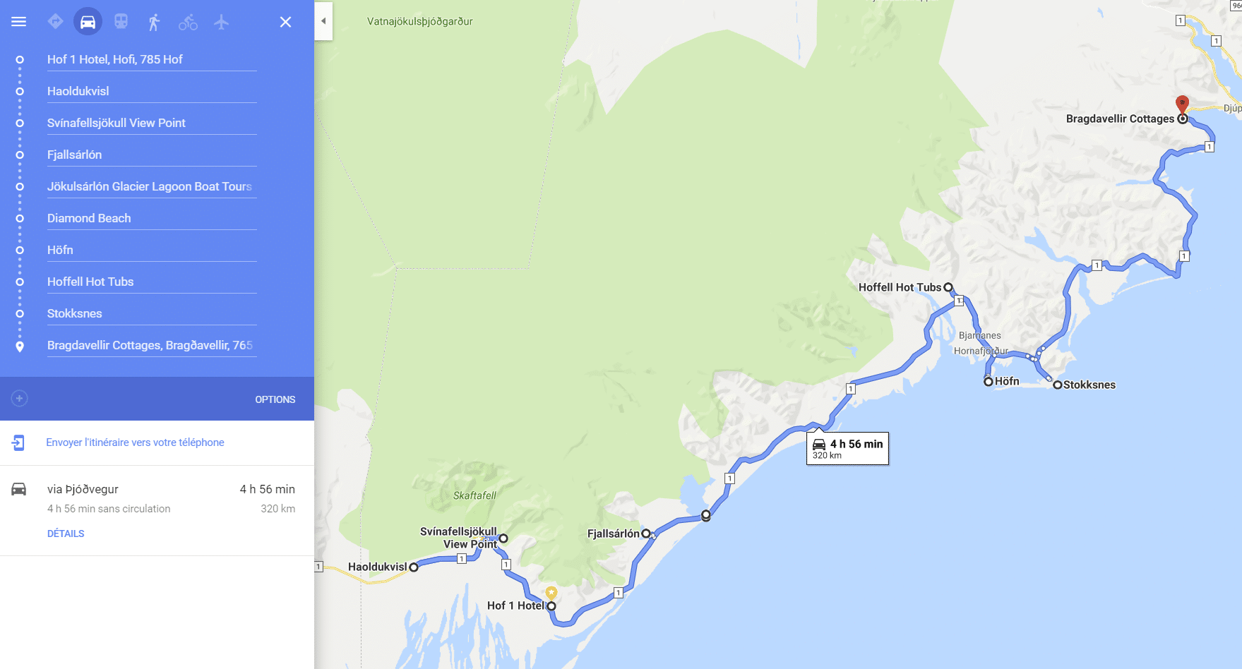 Buscando un poco en Google Maps descubro un sendero que lleva al pie de un glaciar. Bien porque odio caminar (hay una ruta de senderismo al glaciar de al lado, pero es 1h ida y vuelta). Tienes que buscar el aparcamiento de Svinafelljokull en Google Maps. Esta vez, es el camino real. Tiembla por todas partes, mis huesos gritan «ay» y tuvimos que cambiar al modo de 4 ruedas para obtener más potencia.