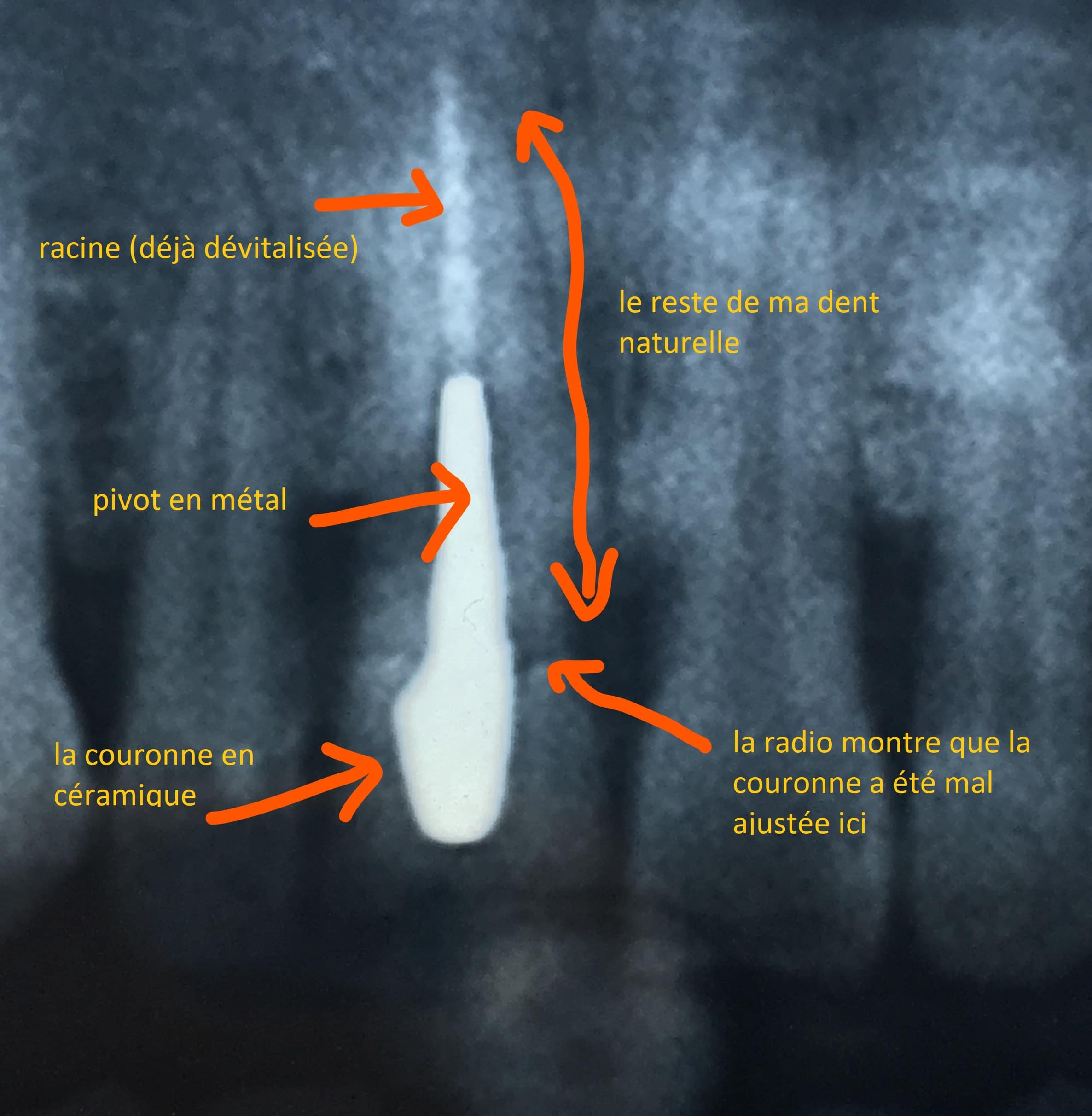 Recientemente, al hacer una radiografía de control en 2019, también me enteré de que el ajuste (entre la corona y el diente final) era un problema. Sinceramente creo que mi dentista hizo un buen trabajo de todos modos (excepto por el grosor) porque la corona duró 8 años, seguramente también tuve una pérdida de hueso, que creó una abertura entre la raíz y la corona. Nota: de todos modos, una corona sólo dura entre 8 y 20 años.