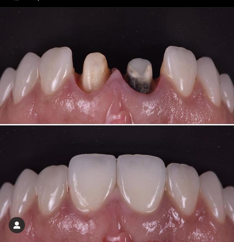 La corona de circonio no necesita un pivote porque el material es muy duro en la base. Permite conservar la mayor parte posible del diente natural. Garantiza un grosor más fino que una corona con poste metálico. Es una pena que mi dentista no me haya informado sobre las diferentes técnicas y materiales disponibles (pros y contras) y vaya directamente a hacer la técnica que más domina. Me parece que en el ejemplo de abajo, el dentista no utiliza un pivote para el diente de la izquierda, sino que ha mantenido todo el diente natural posible, pero oye, el diente natural sigue siendo un diente de ratón.