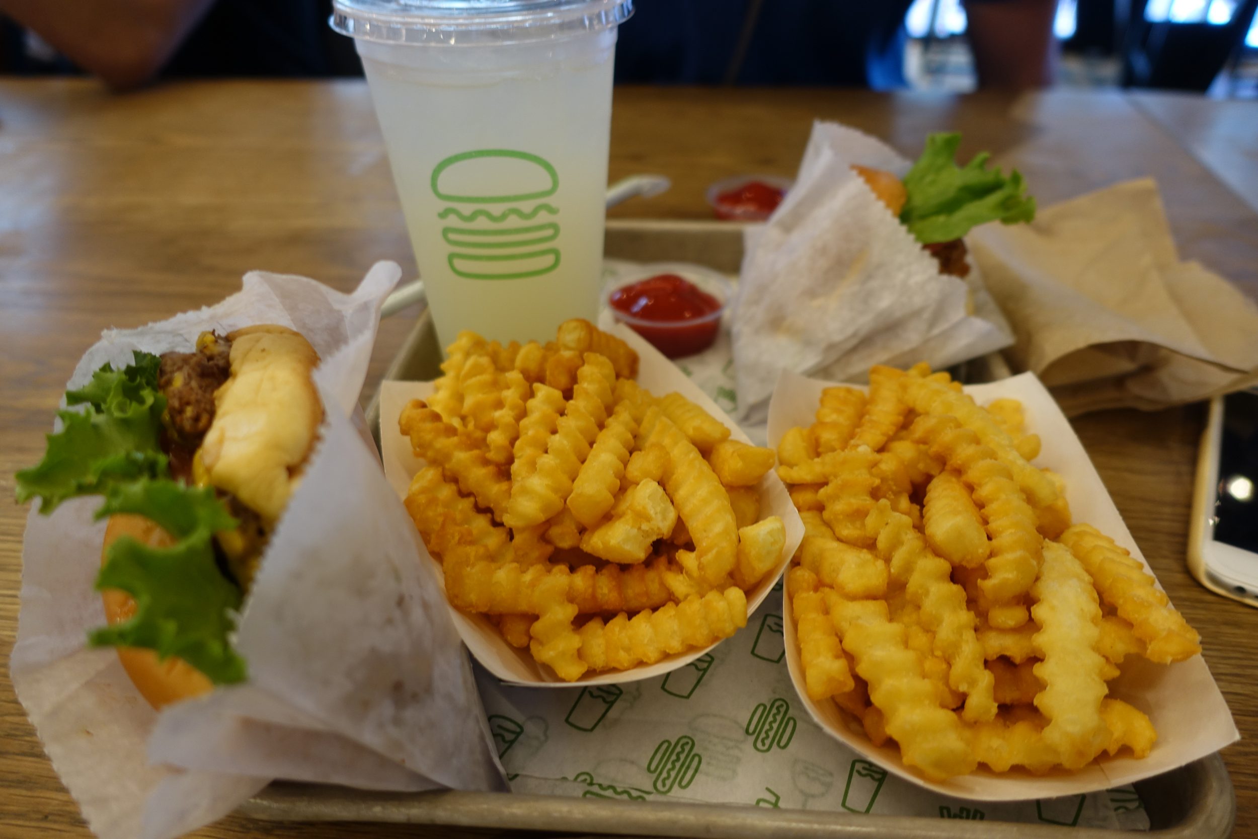 Almorzamos al lado, en Shake Shack, sus patatas fritas onduladas no están mal, pero su hamburguesa no me parece tan buena esta vez (comparada con la de 2015 cuando fuimos a NYC por primera vez).