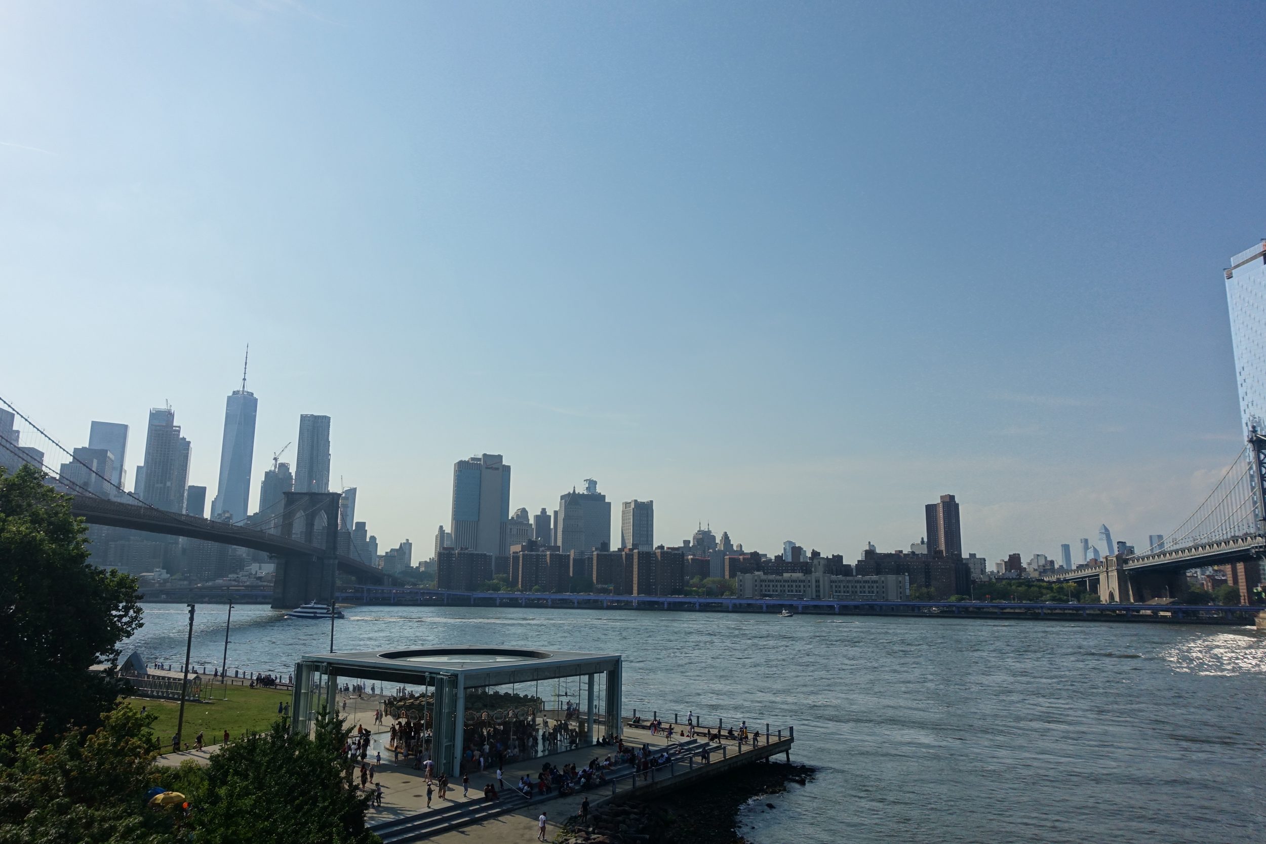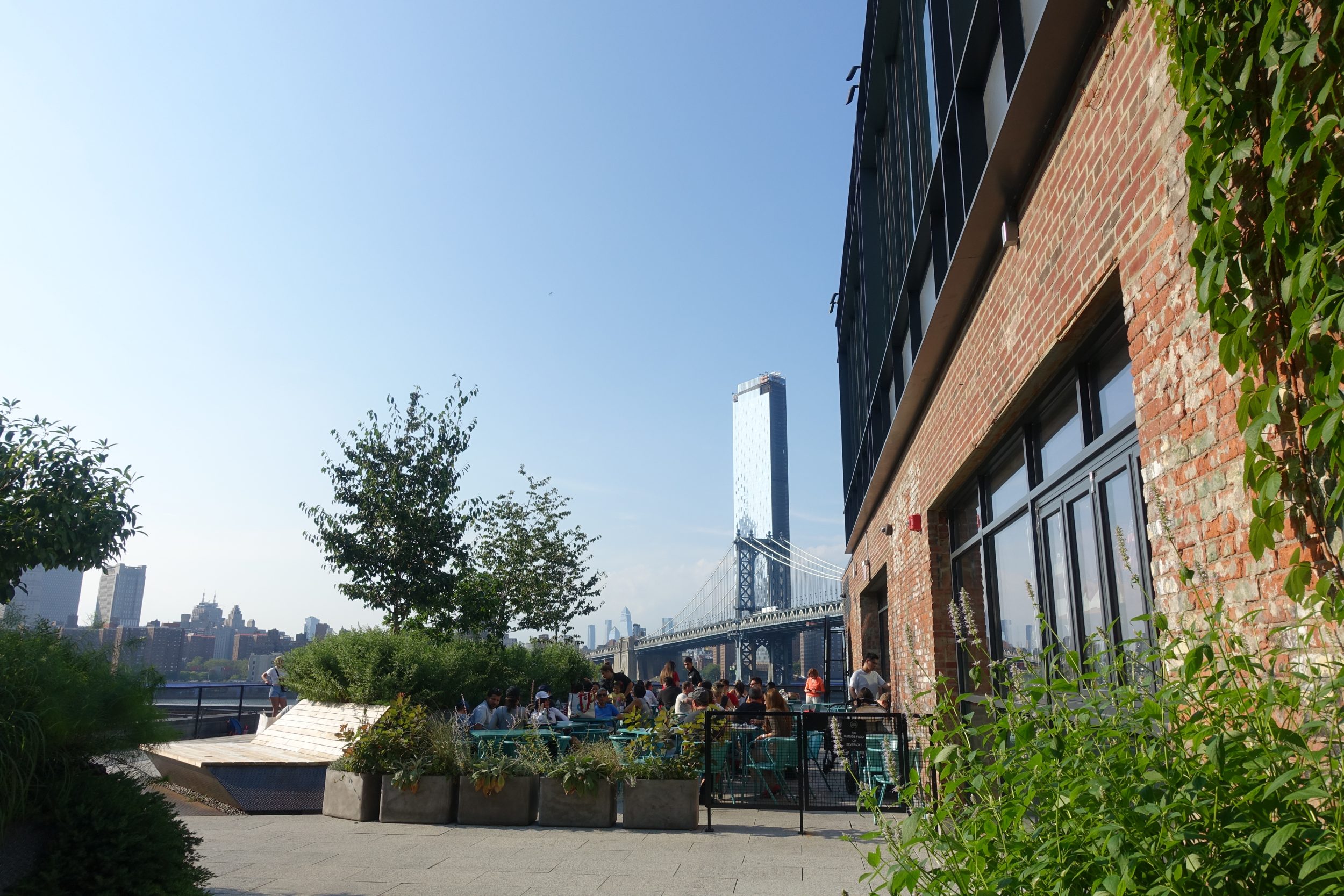 A continuación, tomamos un ferry (2,75 dólares) hasta Brooklyn, en el barrio de Dumbo, y paseamos entre el «Time Out Market» (bonita azotea) y los parques de al lado.