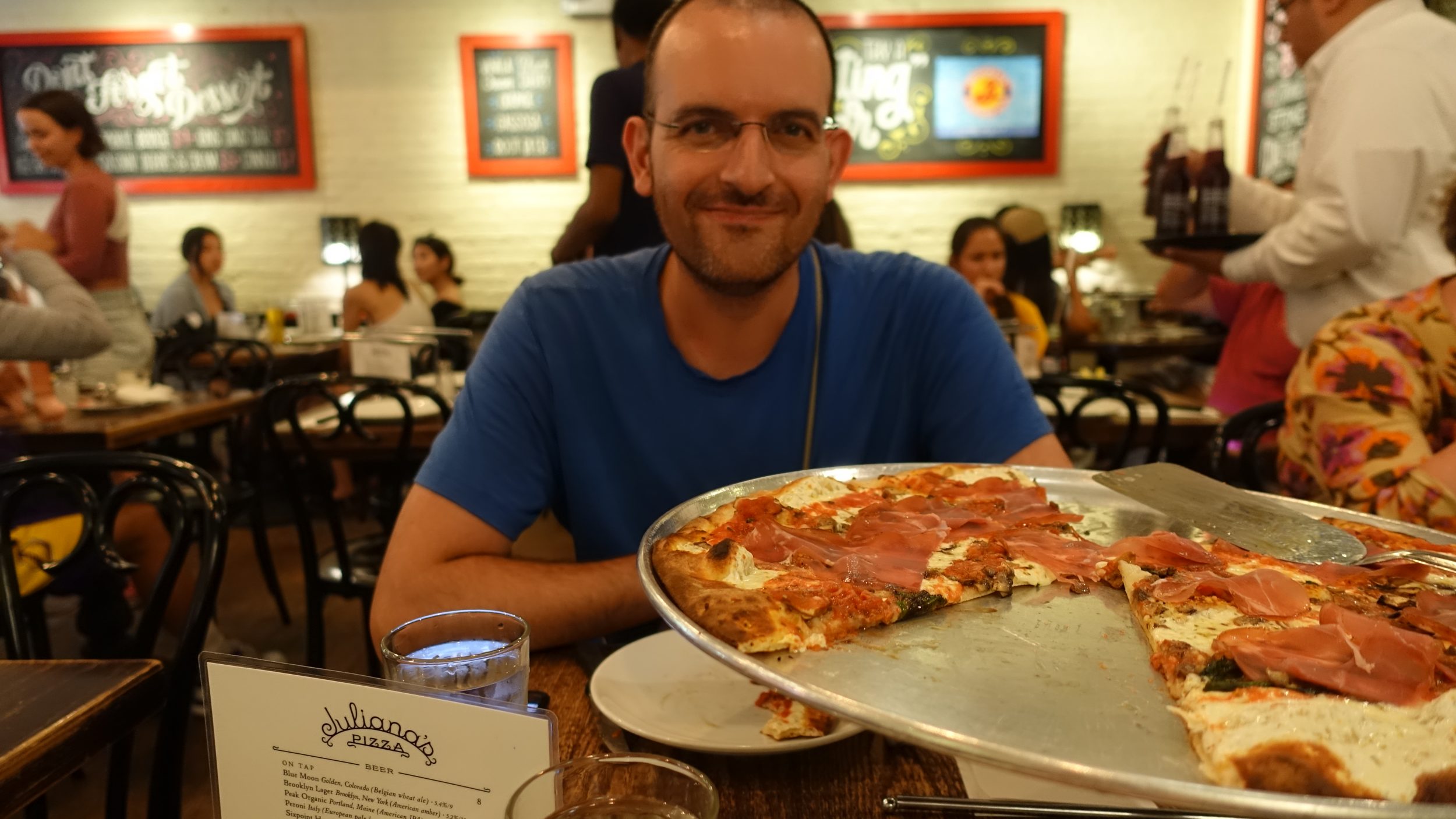 Luego cenamos en casa de Julianna. Justo al lado, hay otra pizzería con al menos una hora de cola. En Julianna’s, sólo esperamos 20 minutos y dice que nuestra pizzería está creada por el mismo tipo que la de al lado. Así que para qué molestarse, ¿verdad? Las pizzas se hacen al carbón y son realmente enormes. Opta por una pizza «grande» para dos, en lugar de llevar una pizza cada uno.