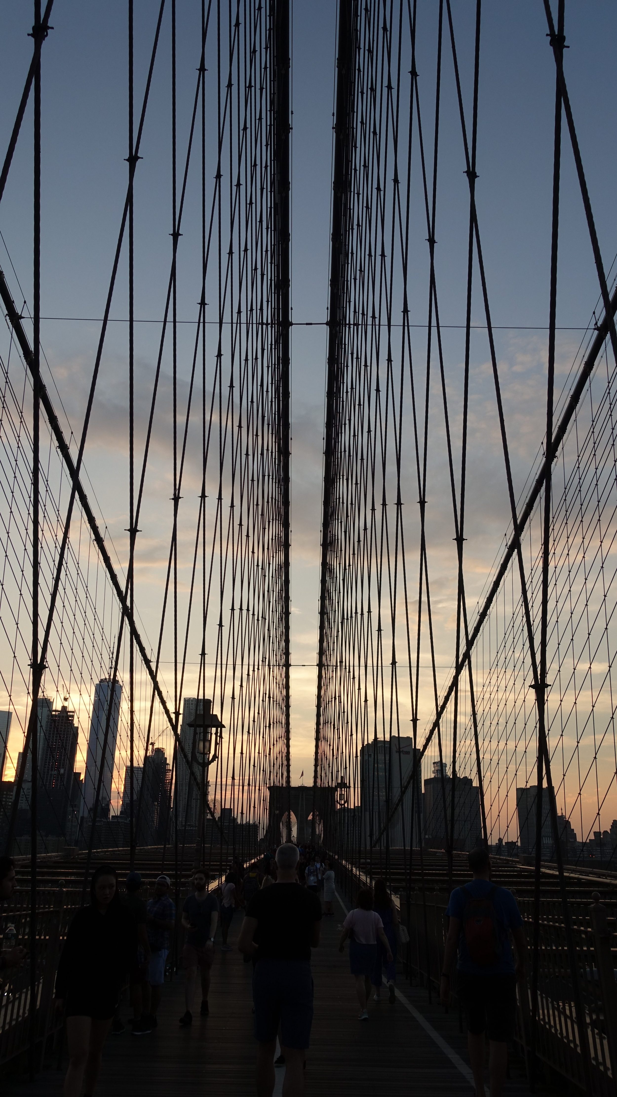 Llegamos a Brooklyn en ferry (también existe la opción del metro) pero volveremos andando a Manhattan. Así es, porque la puesta de sol desde el puente de Brooklyn es una visita obligada En verano, la puesta de sol está prevista a las 20:30, así que vamos, tranquilamente, desde las 19:45.