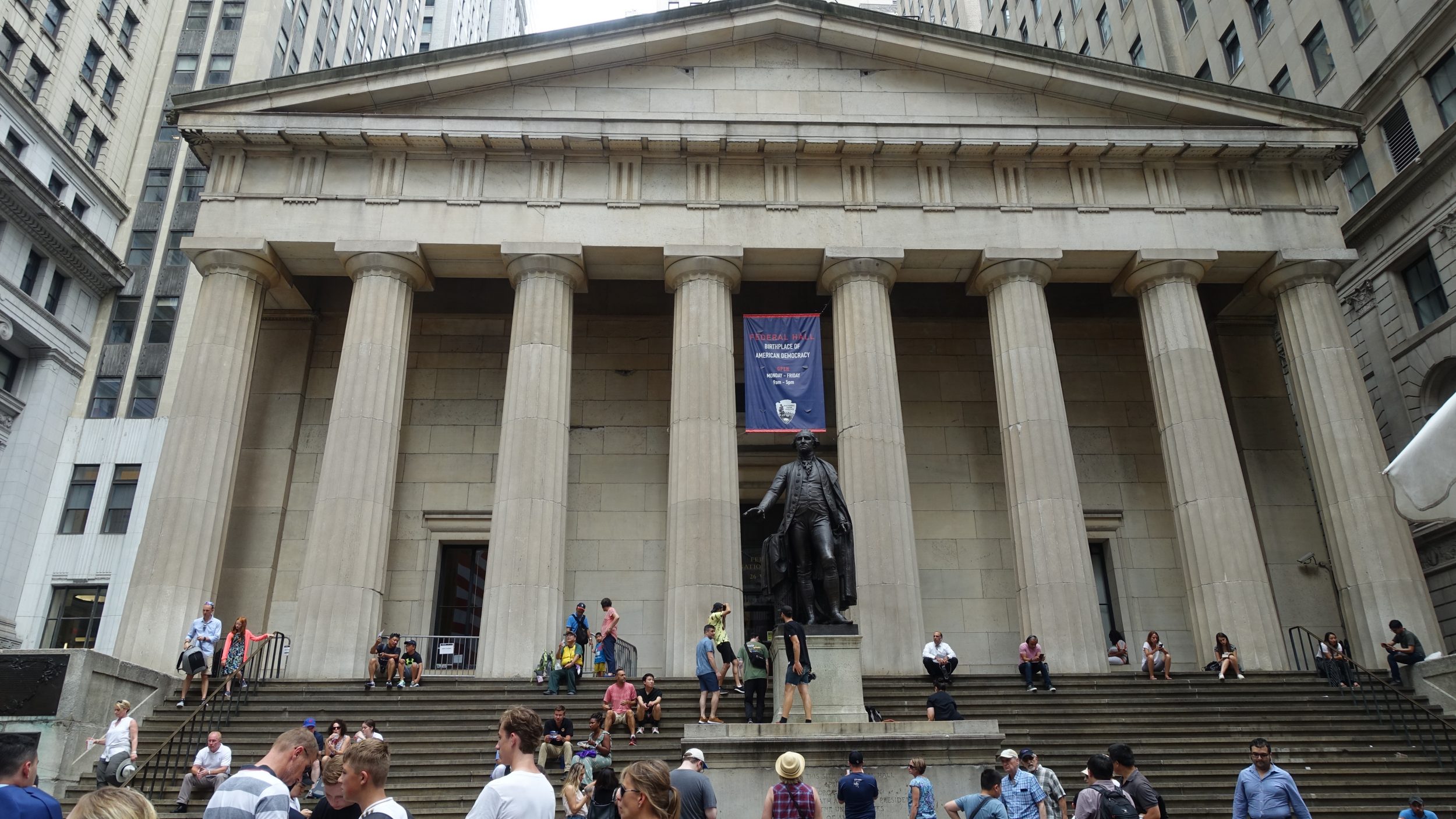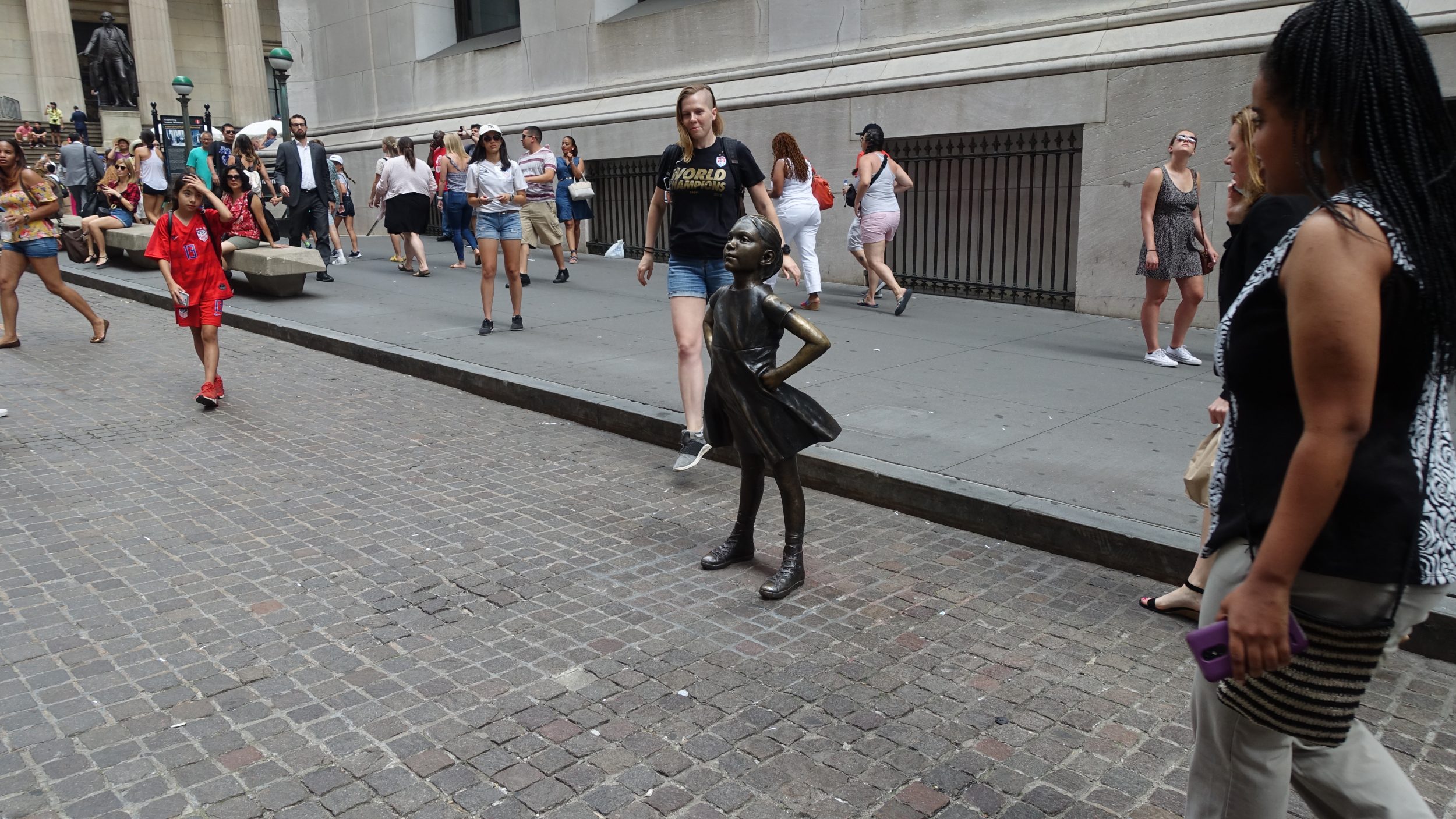 Pasamos por delante de la Bolsa de Nueva York para hacer una foto. Esta parte es peatonal, y justo enfrente está la estatua de la Niña sin Fieras, que ha sido trasladada aquí. Esta estatua se encargó para la publicidad de un fondo de inversión privado, para destacar el alto porcentaje de mujeres de alto rango en su estructura.