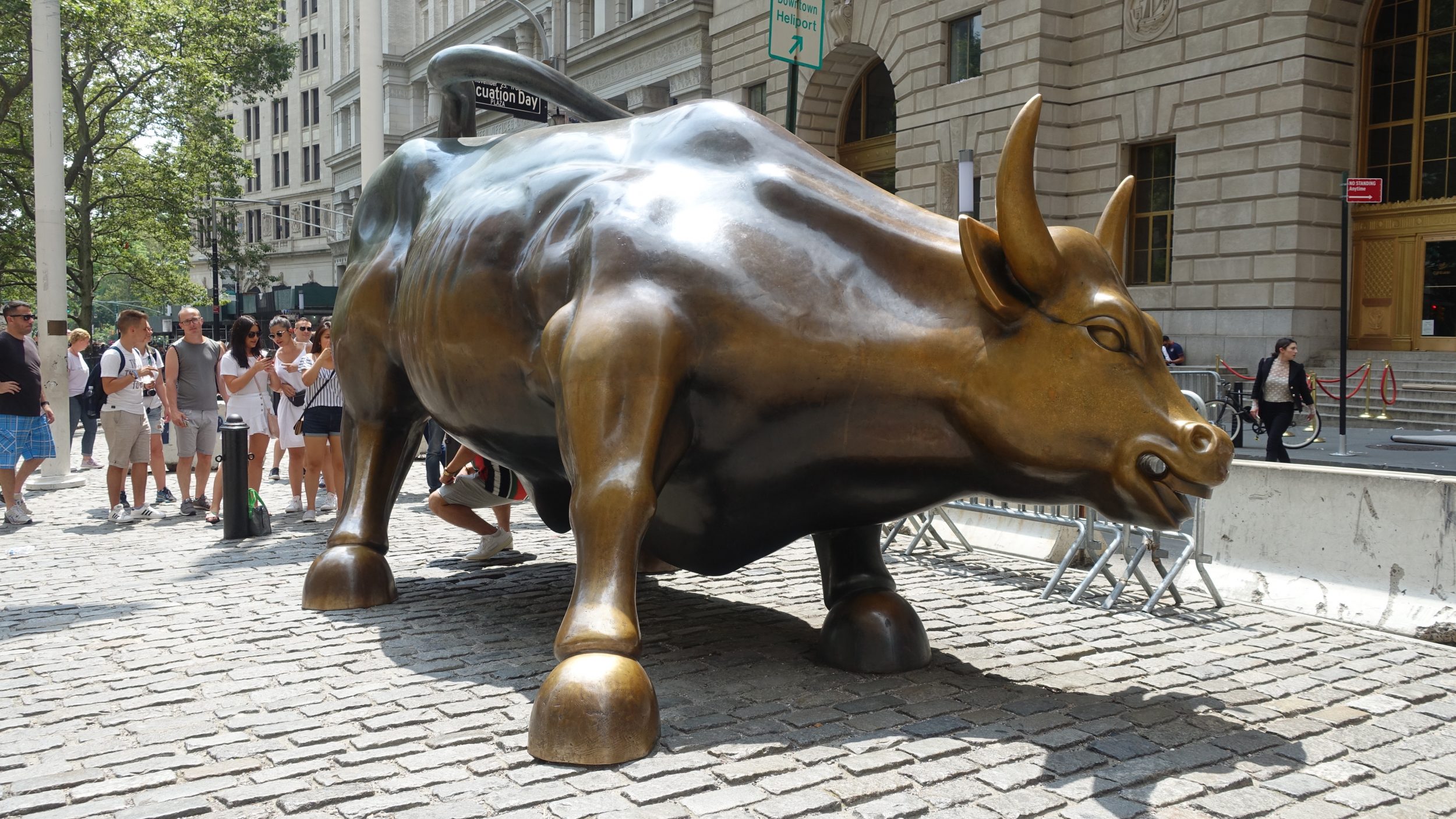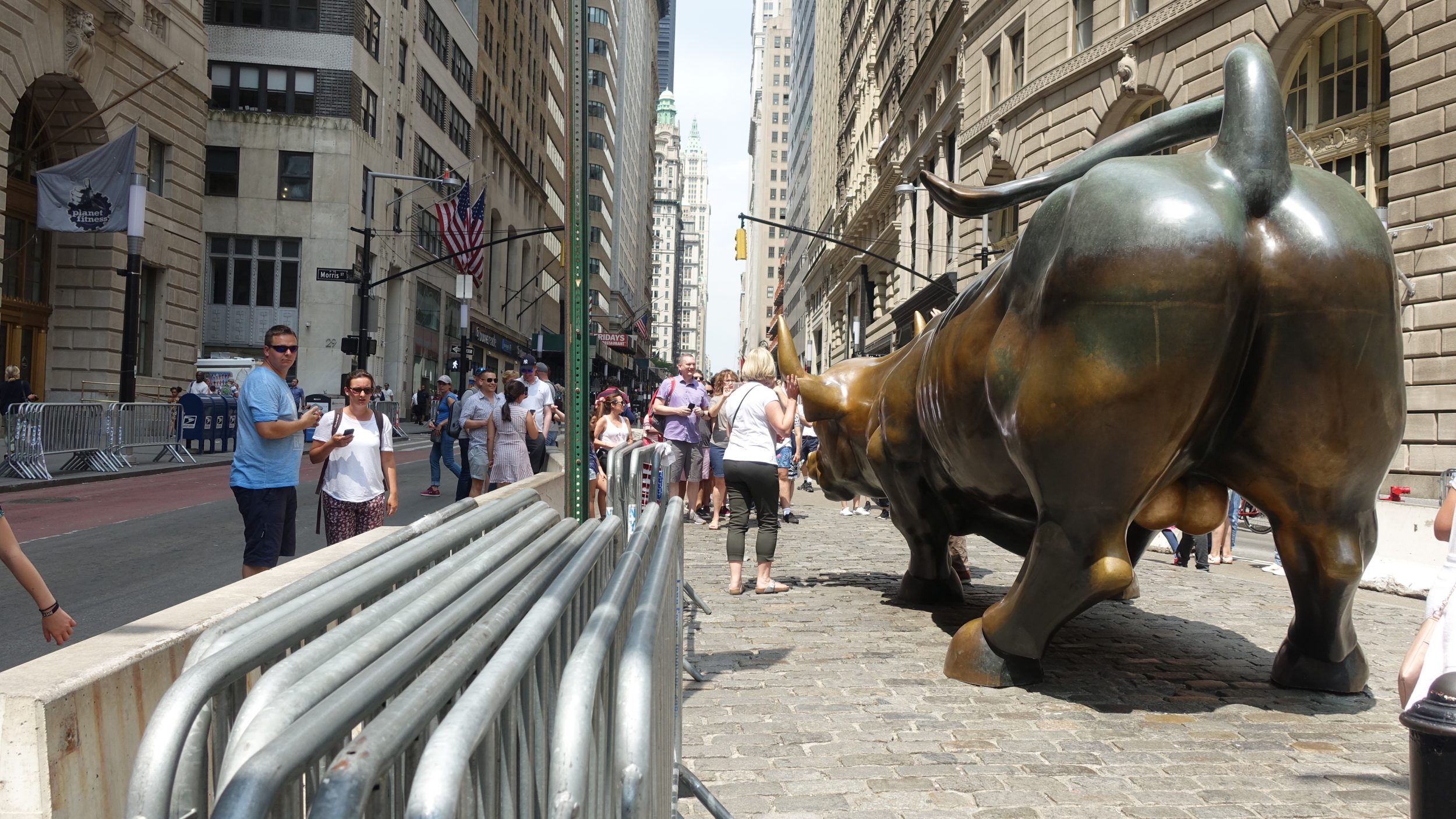 Vamos a la estatua del Toro Cargador, y es divertido. Hay dos pistas: la de hacer la foto DELANTE de la estatua, y la de hacer la foto DETRÁS de la estatua (y ver las enormes bolas del búfalo). La estatua fue colocada allí, sin más, un día, por gratitud del artista Di Modica, reconociendo las oportunidades que le ha ofrecido América. Simboliza la fuerza y el poder del pueblo estadounidense.