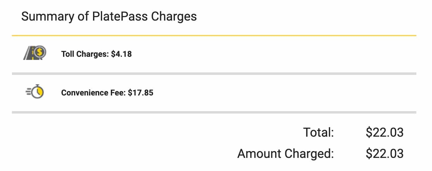- Nada es gratis. En Hertz, le cobrarán 5,95 dólares por día de uso de Platepass. Así que potencialmente puede conducir un día a través de un solo peaje de 50 centavos, lo que sea, añadirán 5,95 dólares a su tarifa. Durante una estancia de varias semanas, eso puede suponer un pequeño presupuesto al final. Anteriormente, el importe total de la tasa tenía un tope. Esto ya no es así. Estas tarifas varían en función de la empresa de alquiler, así que compruébalo, puede que te anime a elegir una en lugar de otra.
