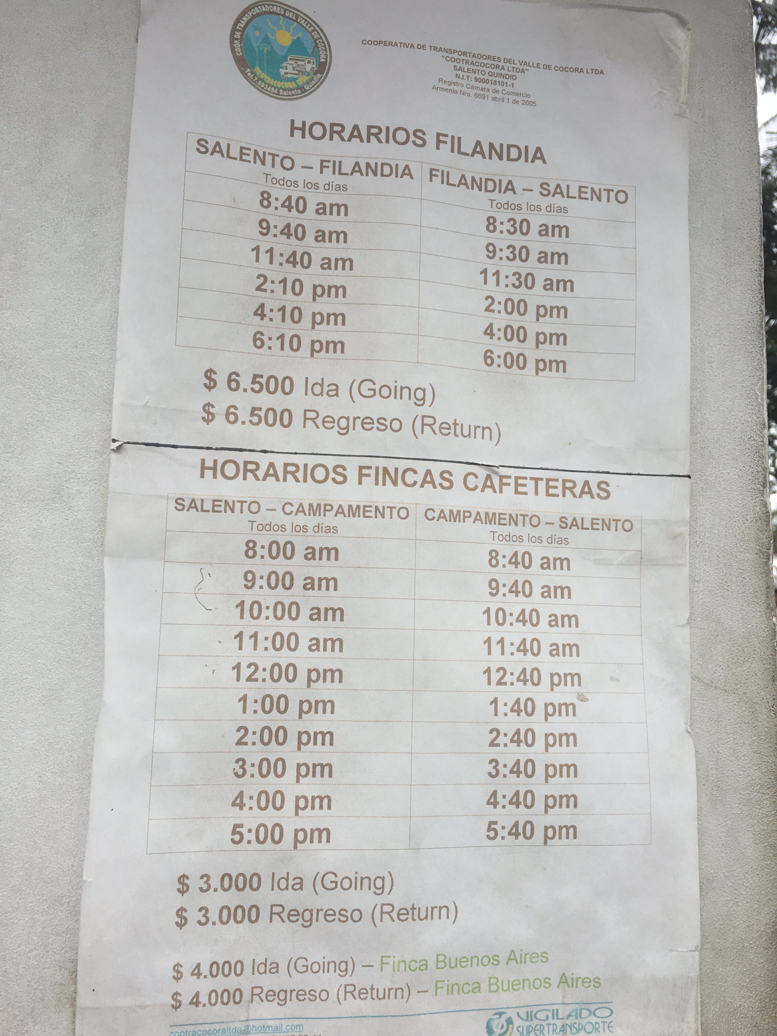 Nota: La oficina de venta de billetes de la terminal de autobuses de Salento sólo está abierta entre las 7:00 y las 16:30. Pero en realidad, si no puede comprar un billete, puede pagar directamente, en efectivo, al conductor.