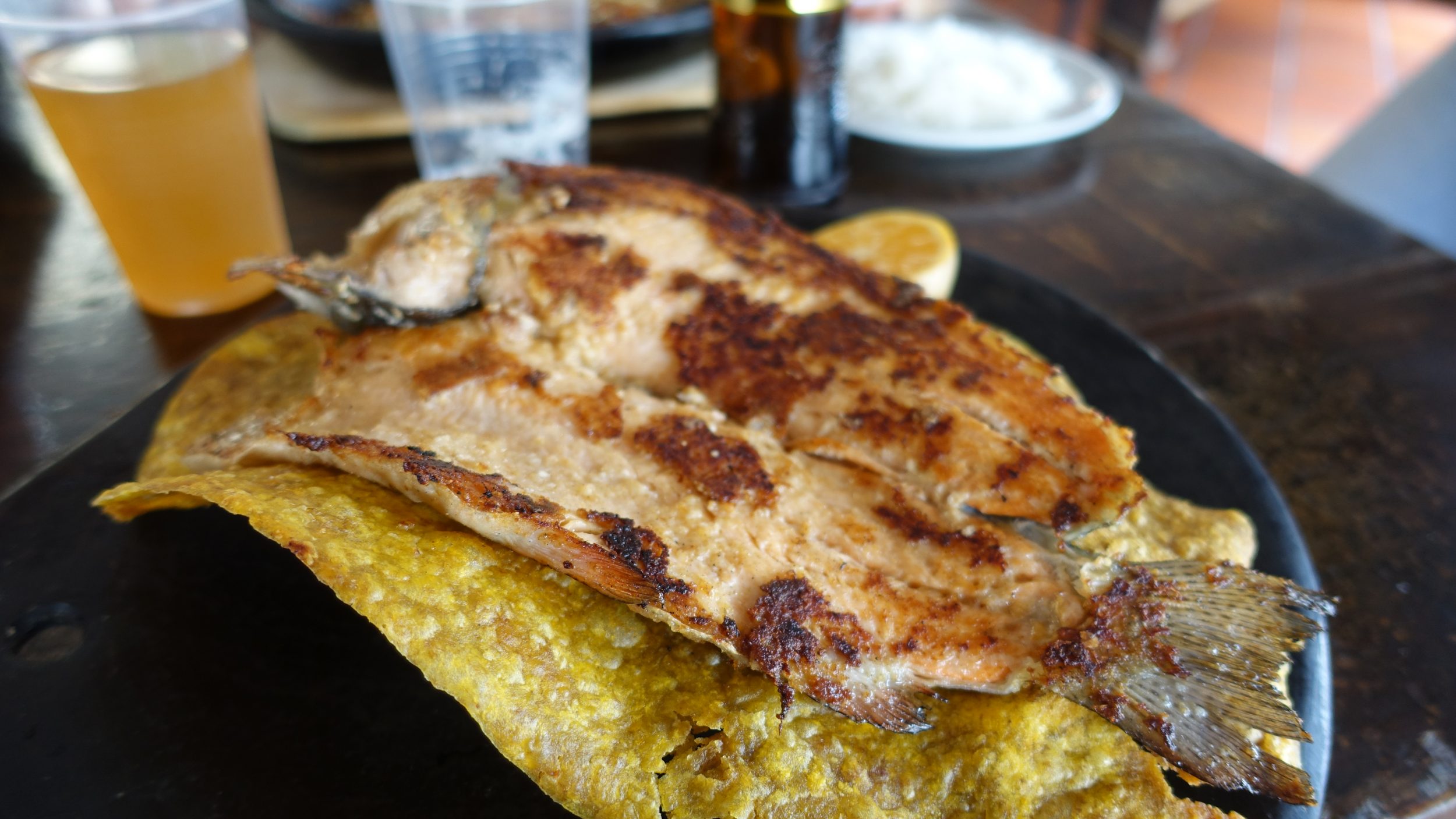 La trucha, la especialidad local, es deliciosa. Optamos por una trucha asada cada uno, acompañada de ensalada y un enorme trozo de plátano macho. Durante 3 días, comeremos casi sólo truchas, pero la de Antorchas es realmente la mejor, la más fresca y la más sabrosa. Después de la comida, nos encontramos en Dora: el domingo a mediodía (2 días después), en el mismo restaurante.