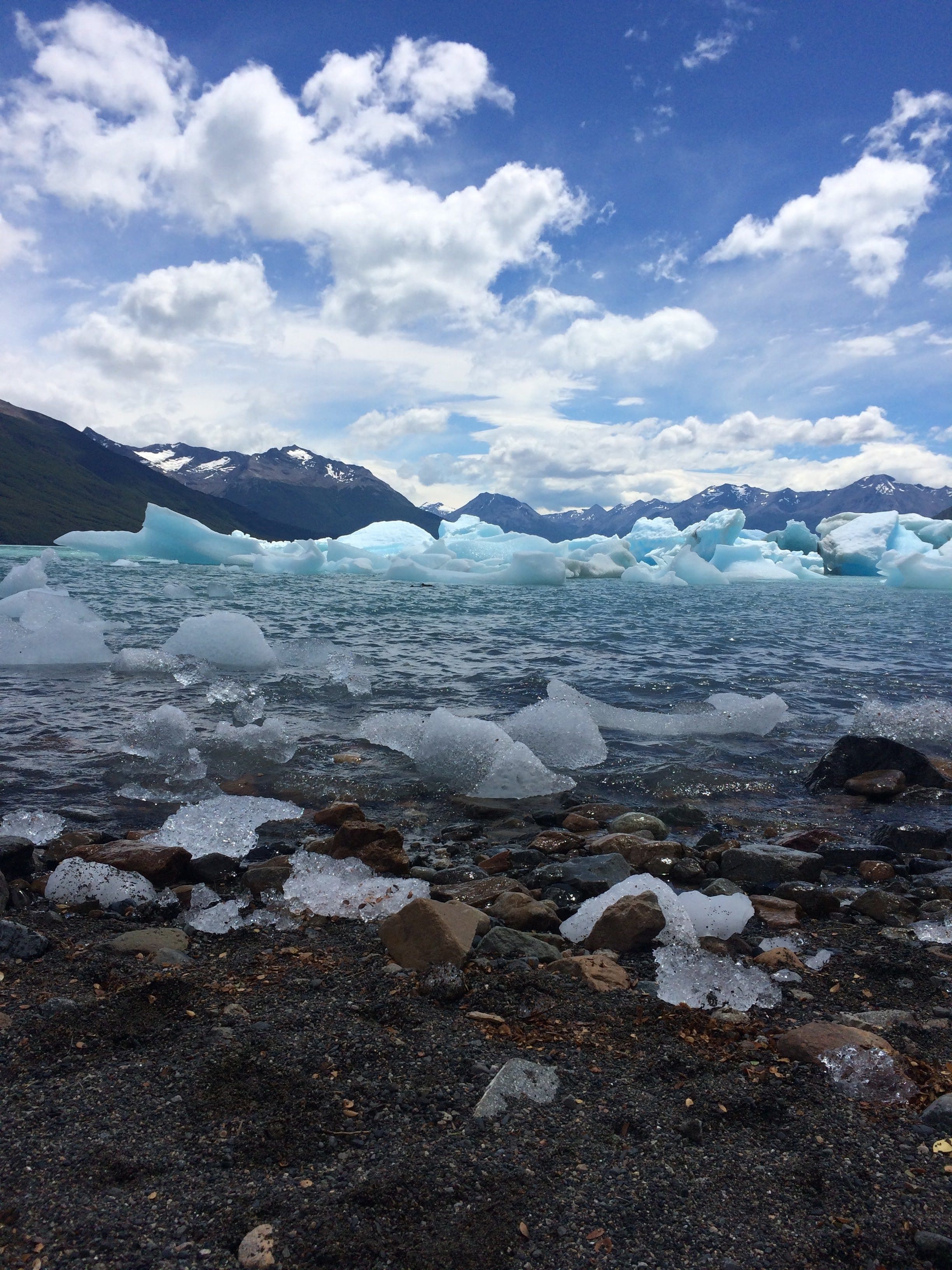 Para terminar nuestra visita, nos dirigimos al lago donde flotan enormes icebergs. Recojo uno pequeño para divertirme pero no está lo suficientemente limpio como para probarlo. En cualquier caso, en el bar cercano al aparcamiento, podemos comprar chupitos de whisky con hielo del glaciar por 100$AR. El oxígeno atrapado en estos icebergs puede tener 500 años de antigüedad