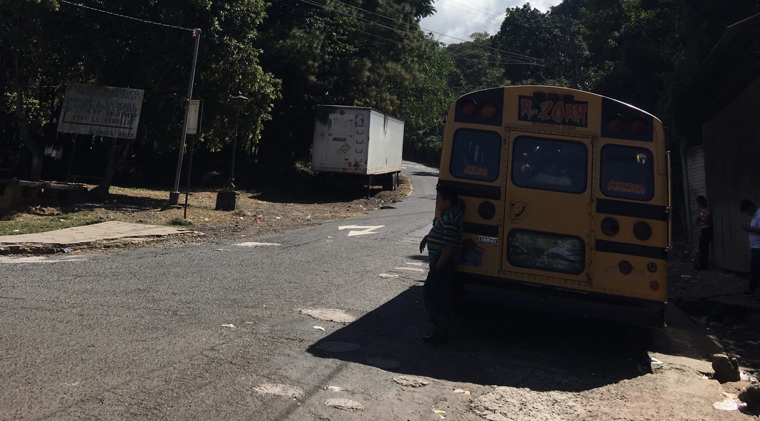 - Desde Ahuachapan, camine 6 minutos (o tome un tuktuk, $0,5) hasta la salida del minibús a Concepción de Ataco(Google Maps), que sale cuando está lleno ($0,5). No hay maletero pero se puede dejar en el pequeño pasillo. El viaje es rápido, así que si te mantienes de pie durante todo el viaje, tampoco es horrible. Ataco no es la terminal, sino la parada del autobús. La parada de Ataco está justo a la entrada del pueblo(Google Maps)