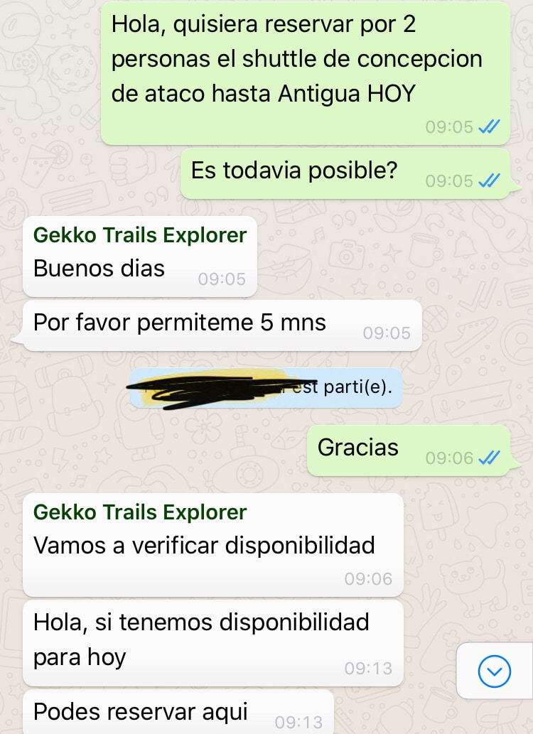Reservamos el viaje sobre la marcha y contactamos con gekkotrailsexplorer.com por Whatsapp. Me confirmaron rápidamente que aún quedan 2 plazas disponibles.