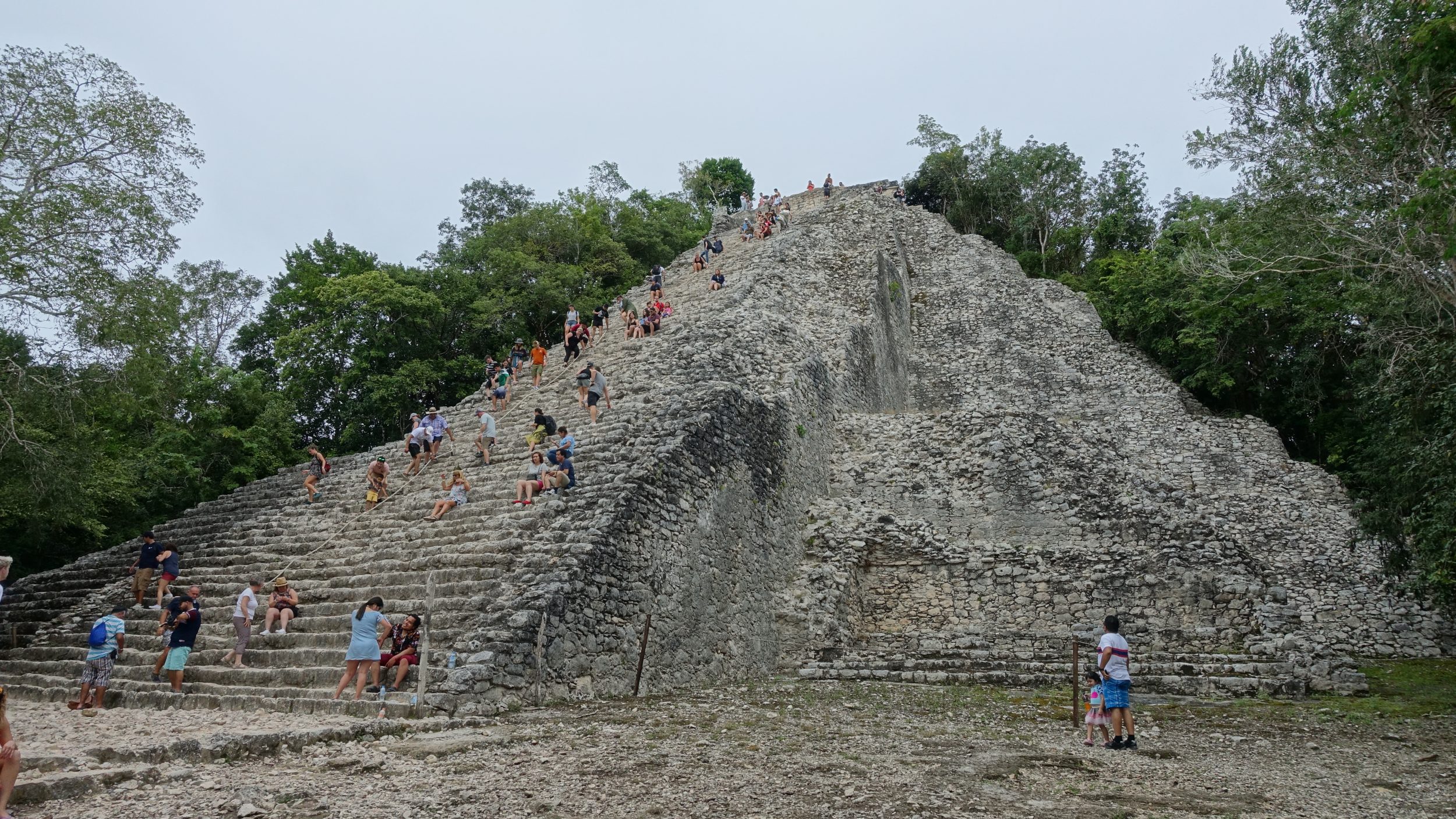 Tomamos un pequeño camino sombreado y pasamos por varias ruinas. Pues queremos ir primero al sitio mágico que se ve en Instagram: la pirámide de Nohoch Mul, una de las más altas de la región (42 metros incluyendo el templo de arriba), que antiguamente se utilizaba para celebrar el poder sagrado de los dignatarios. Al llegar al lugar, uno se asombra al ver un templo medio destruido (toda la parte izquierda ha desaparecido), con escalones irregulares, muy empinados y llenos de gente. Tengo que comprobar 3 veces que estoy en el lugar correcto porque no me parece que haya visto lo mismo en el lugar frente a las fotos de Instagram.