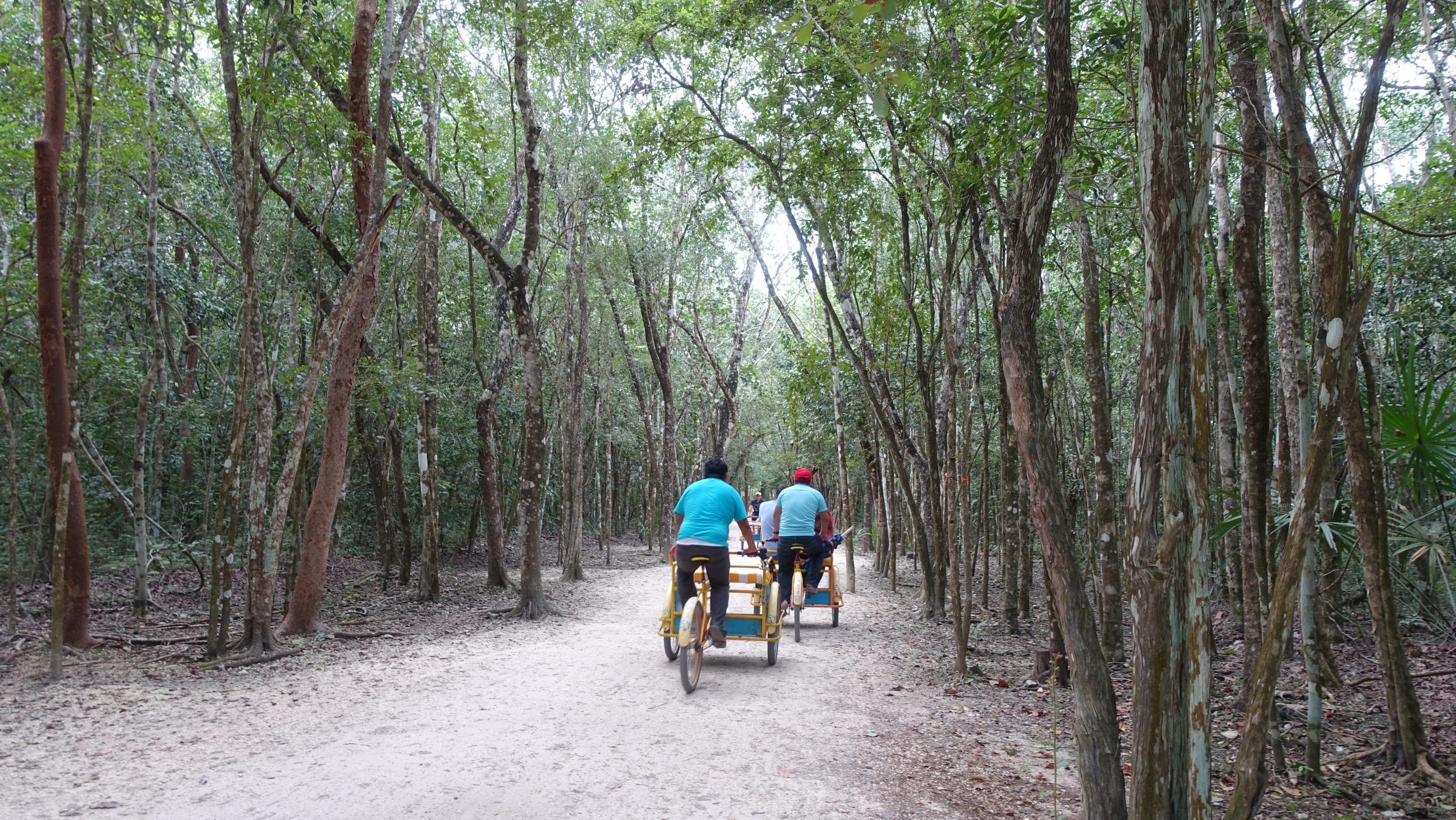 Avanzamos unos metros y vemos un centenar de bicicletas de alquiler dentro del recinto (50MXN/bicicleta). Podemos caminar, pero pedalear en un sitio arqueológico es más divertido, ¿no? Para los que no saben/no quieren ir en bicicleta, hay triciclos con «conductores» que ofrecen su servicio por 125MXN (1h20, espera incluida) o 200MXN (2h, espera incluida). Hay que elegir bien la bicicleta porque la mayoría de ellas sólo tienen el freno de pedal, que es más difícil de maniobrar.