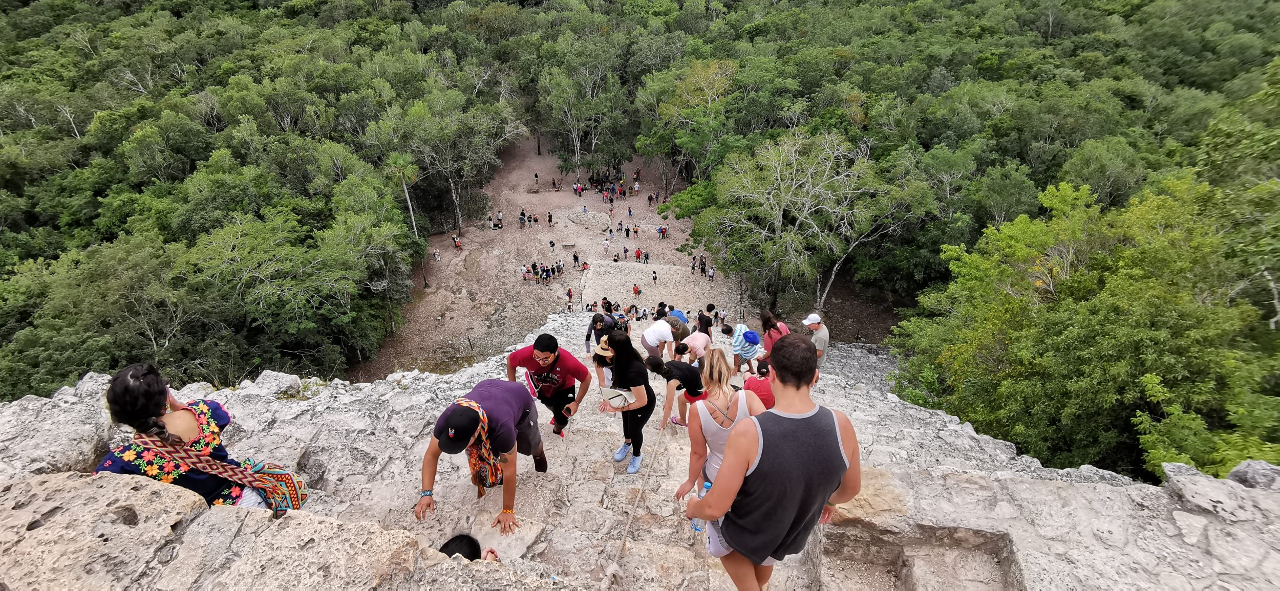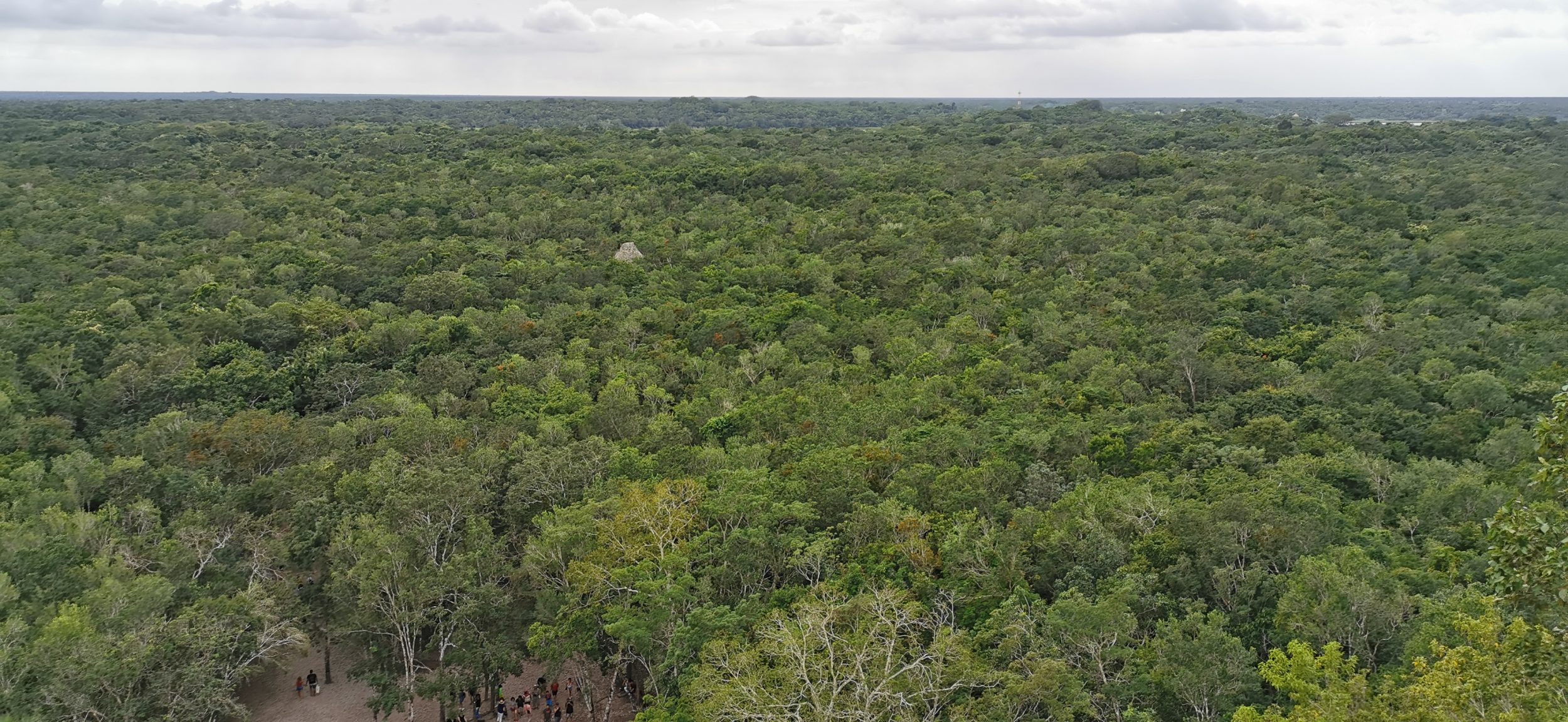 Por desgracia, la vista desde arriba -de los árboles y una pequeña estructura en la distancia- no merece la pena. La gente se empuja, demasiado ocupada haciéndose un selfie. Como toda la zona de atrás está bloqueada por los árboles, todo el mundo se concentra en una pequeña zona cerca del borde. Debería haber elegido Ek Balam desde el principio, en realidad.