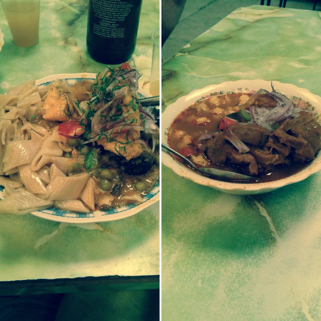 Las primeras pruebas son concluyentes: la carne de llama (a la derecha) está súper buena. Y el pollo con chile (izquierda) también está muy bueno. 13$B/placa. Por la noche, nos conformamos con una ración de pollo estofado con arroz y patatas fritas (15$B cada uno).