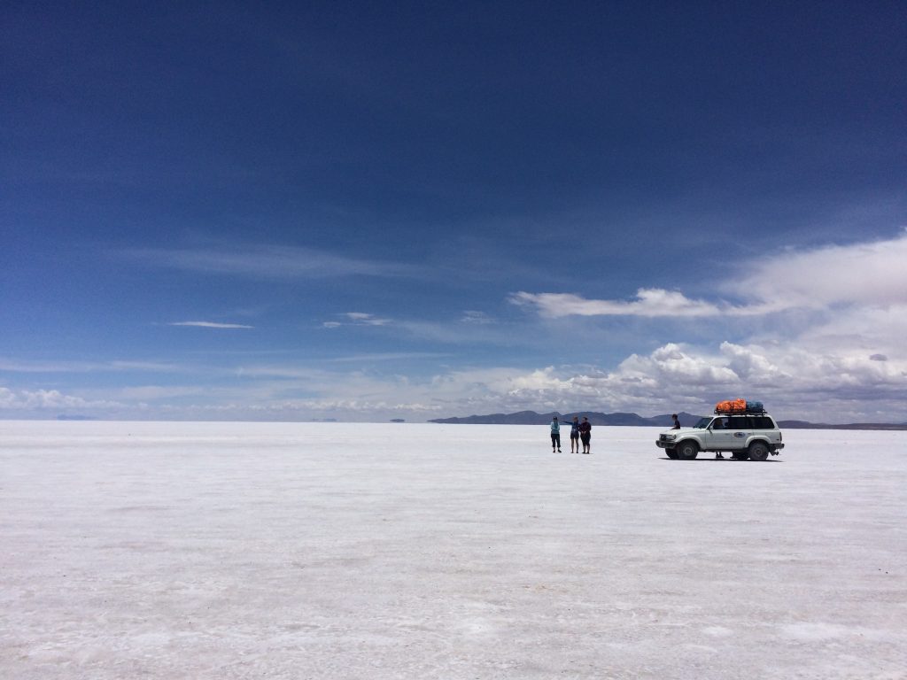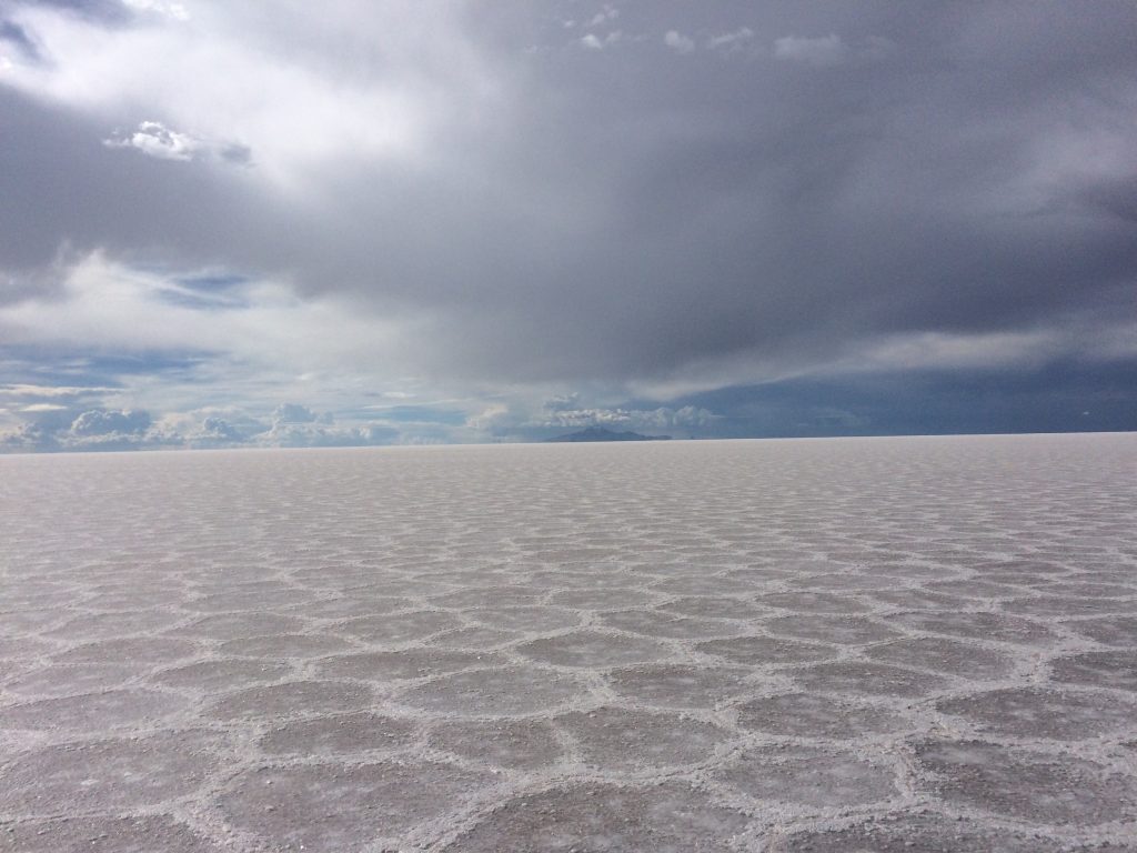 El salar de Uyuni está así la mayor parte del tiempo. Es muy bonito, con una superficie agrietada. Cuando hace sol, todo es blanco y deslumbrante. Sin embargo, no tiene en absoluto el encanto de un salar inundado. Sinceramente, me habría decepcionado un poco si hubiera venido en un momento en el que sólo me hubieran mostrado un salar totalmente seco (estoy hastiado pero en realidad, hemos visto tantas cosas maravillosas que somos muy exigentes ahora)