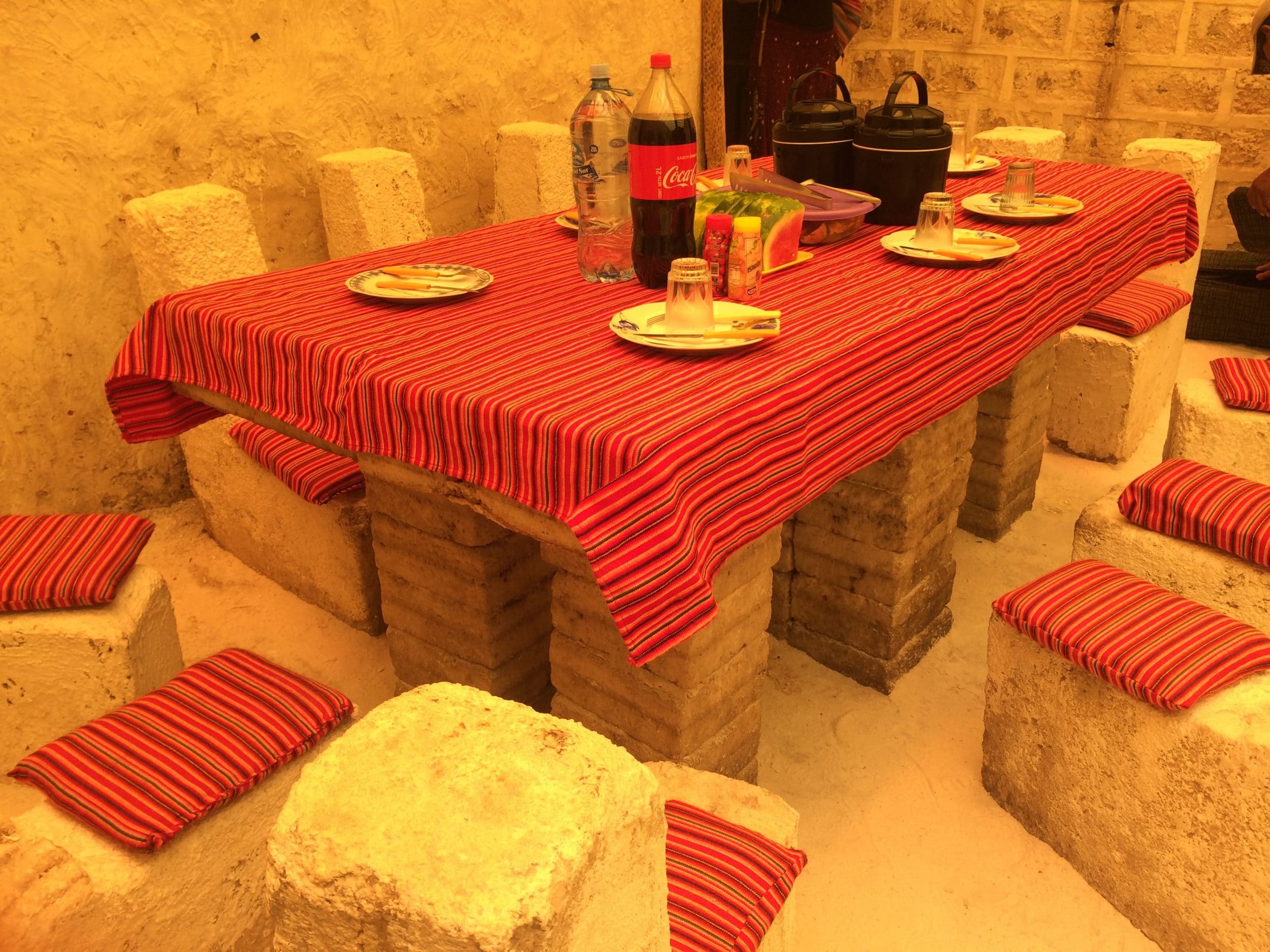La comida es sencilla pero lo suficientemente consistente como para hacer frente a este agotador día. Fíjate en las sillas super saladas y en los pequeños cojines blandos